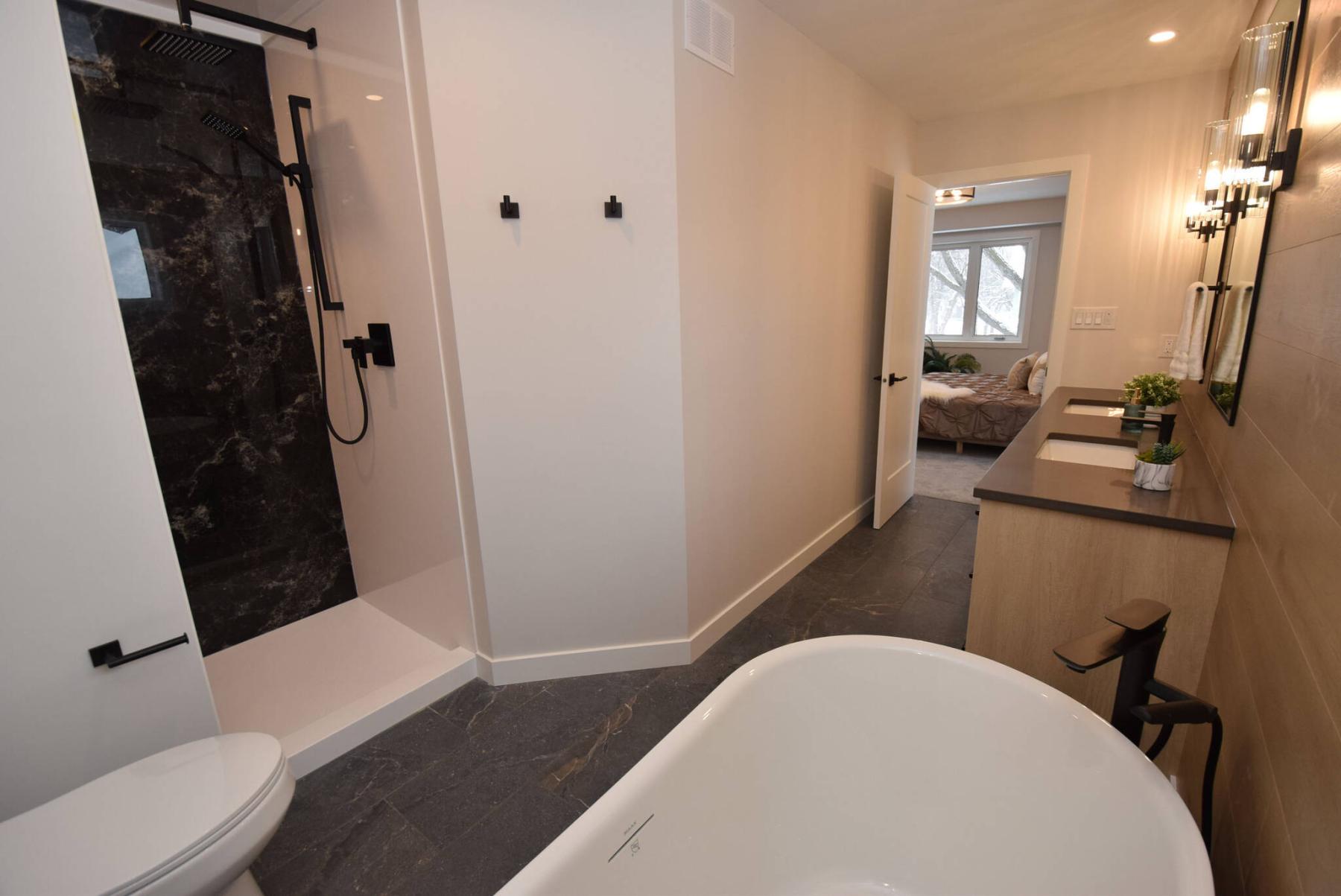 A spa-like space, the ensuite comes with a heated tile floor, deep soaker tub and a gorgeous walk-in shower with black-marble backdrop.