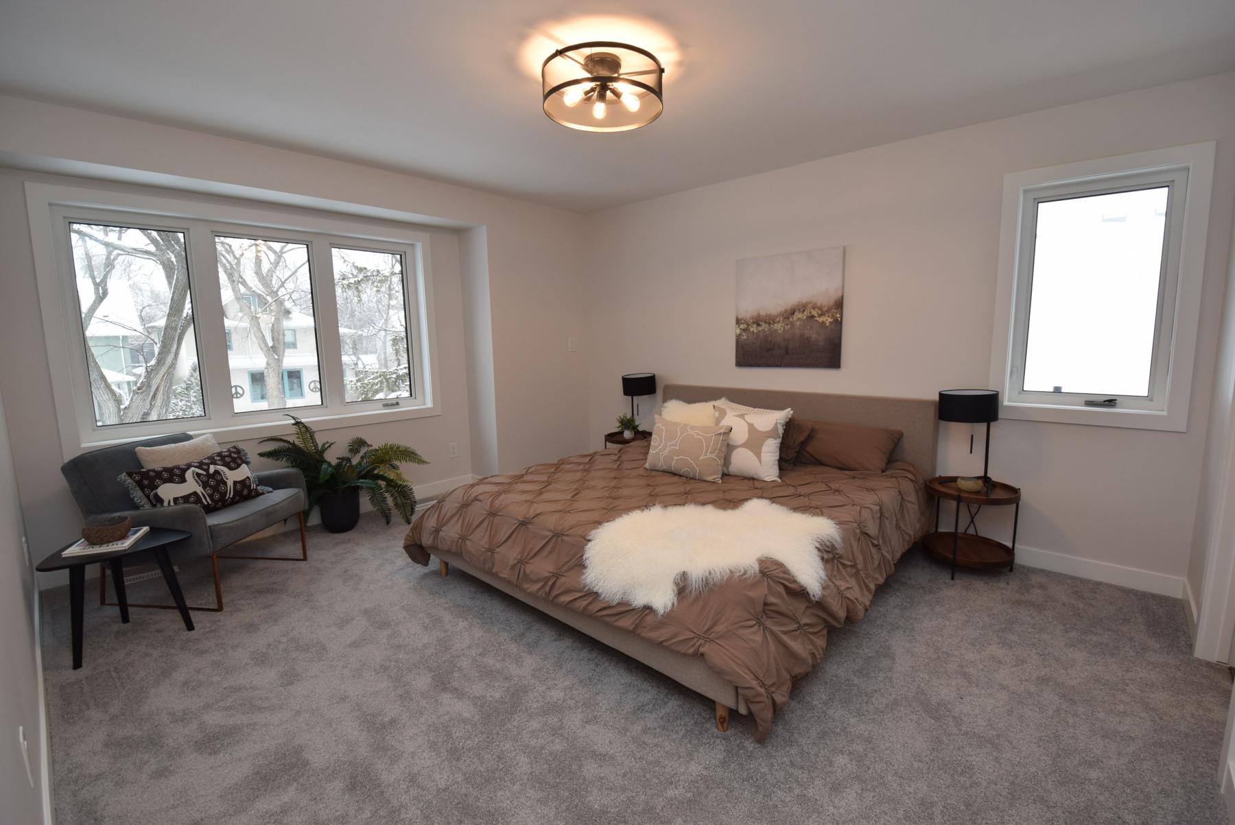 The spacious primary bedroom is filled with natural light and offers beautiful treetop views of the mature, established neighbourhood.