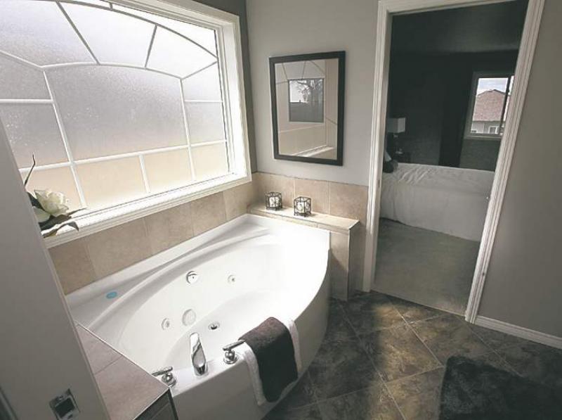 "It's massive," he said. "There's plenty of room for a king-size bed and furniture, even a reading chair in the corner. A huge window lets in all kinds of light, while the ensuite -- it comes with a jetted soaker tub (under a big obscured glass window that ensures privacy while letting in loads of light), brown dura ceramic tile floor, (cinnamon-tinted) maple vanity and separate four-foot shower. There's also a big walk-in closet, as well."