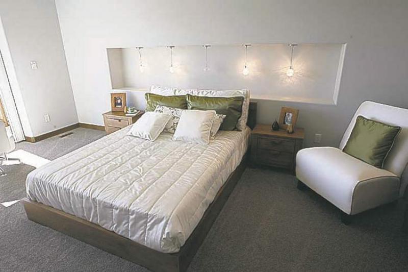 The master suite itself is marvellous. First, there's the elevated water view that's framed by a three-piece window with maple trim. The bedroom offers all kinds of space, plus fashion touches such as a recessed niche behind the bed with pendant lighting. The ensuite's presence is then announced by a grey/bronze marble wall with an inset, two-sided gas fireplace.