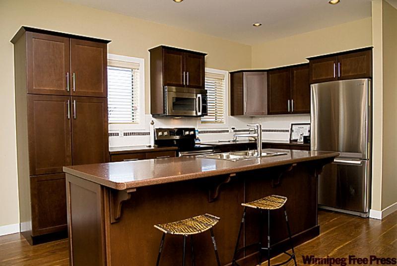 "This is a very efficiently designed home upstairs and down," Finch says. "The kitchen has an eight-foot island with double sink, an optional eating ledge, maple cabinetry with a large pantry, and plenty of counter space (on dark brown arborite countertops). There's then a dining area for six between the kitchen and living room, which has a beautiful electric fireplace as its focal point."