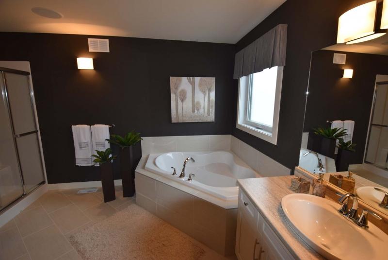 "The ensuite is particularly luxurious with its corner soaker tub (set in tan tile beneath a large, obscured glass window), tile floor, maple vanity and five-foot shower."