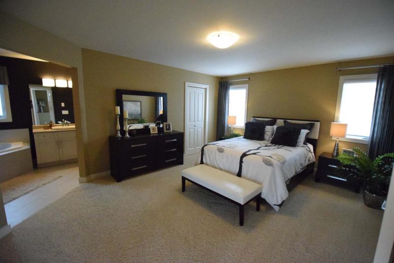 An angled, double-door entrance leads into a spacious master suite that features an open-concept ensuite with corner soaker tub,tile floor and five-foot shower.