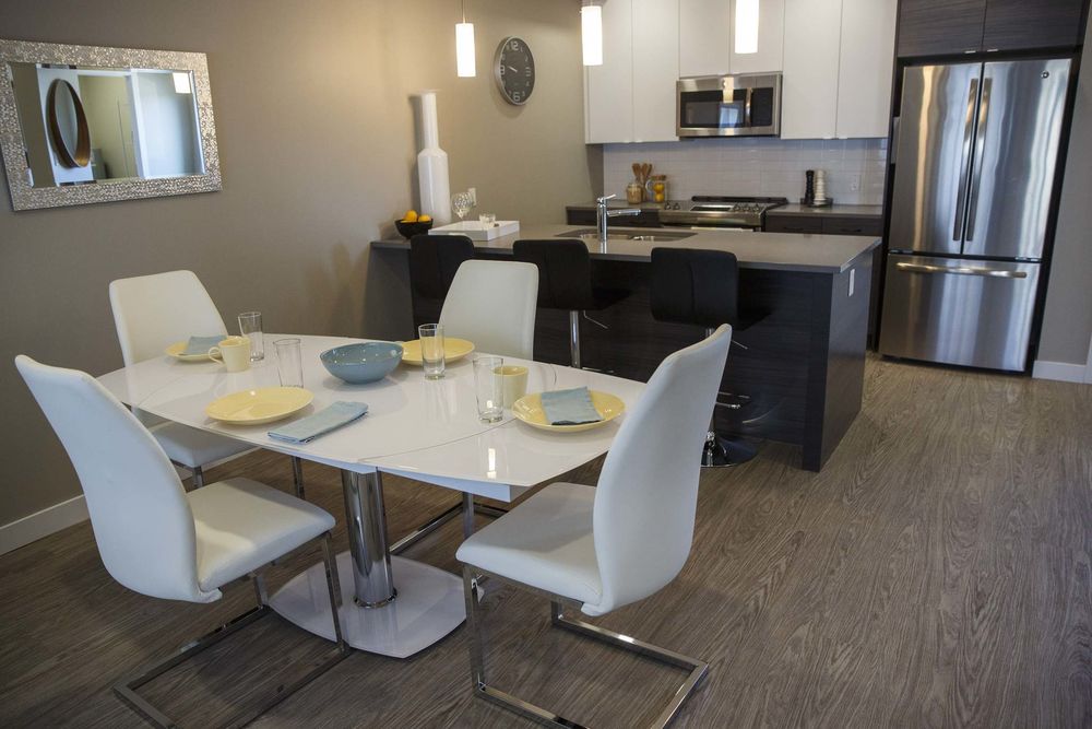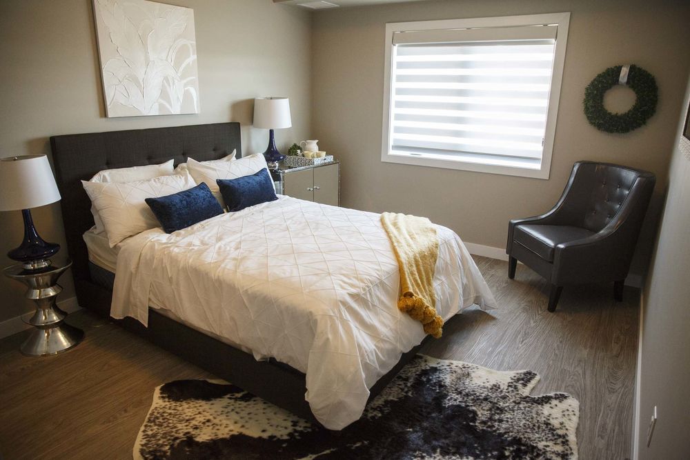 "All finishes are high-end," Penner says. "Buyers get their choice of white or dark thermofoil cabinets, or maple cabinets. A tile backsplash and quartz countertops come standard, as does a full appliance set — stainless kitchen appliances and a stackable washer/dryer. The luxury vinyl plank flooring that runs through each suite is beautiful and durable."
