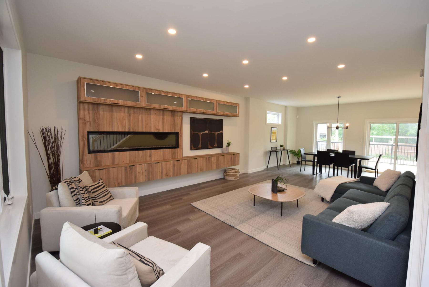 “The first thing you notice when you enter the living room is the custom entertainment unit,” she says. “It’s just gorgeous with its walnut veneer finish, six-foot linear electric fireplace, huge TV area and all kinds of storage both above and below.”