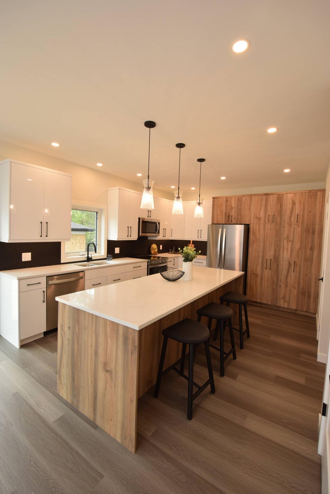“A nine-foot island serves as its anchor point. Not only does it have an eating nook for three, but it’s an ideal prep space for cooking and serving area for entertaining. Glossy white cabinets add a modern touch, while the pantry, with its walnut veneer finish, adds warmth. A dark hexagonal tile backsplash adds contrast and stainless appliances add class.”