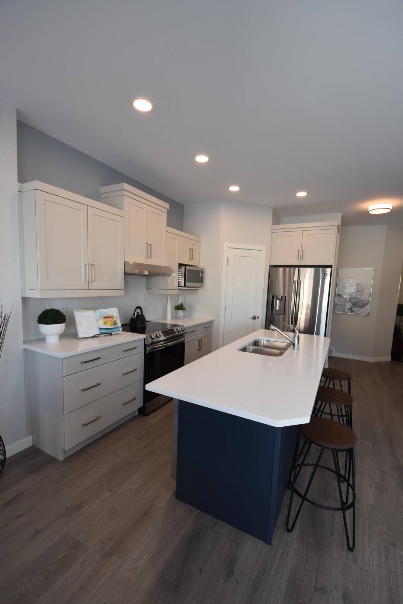 An eight-foot island with double sink, quartz countertop and eating nook are highlights of this West St. Paul home’s kitchen.