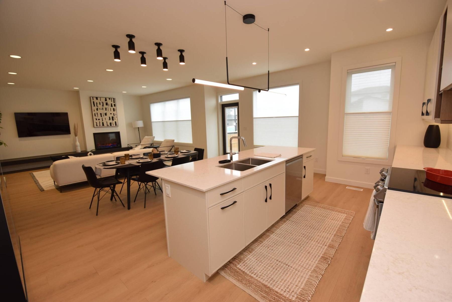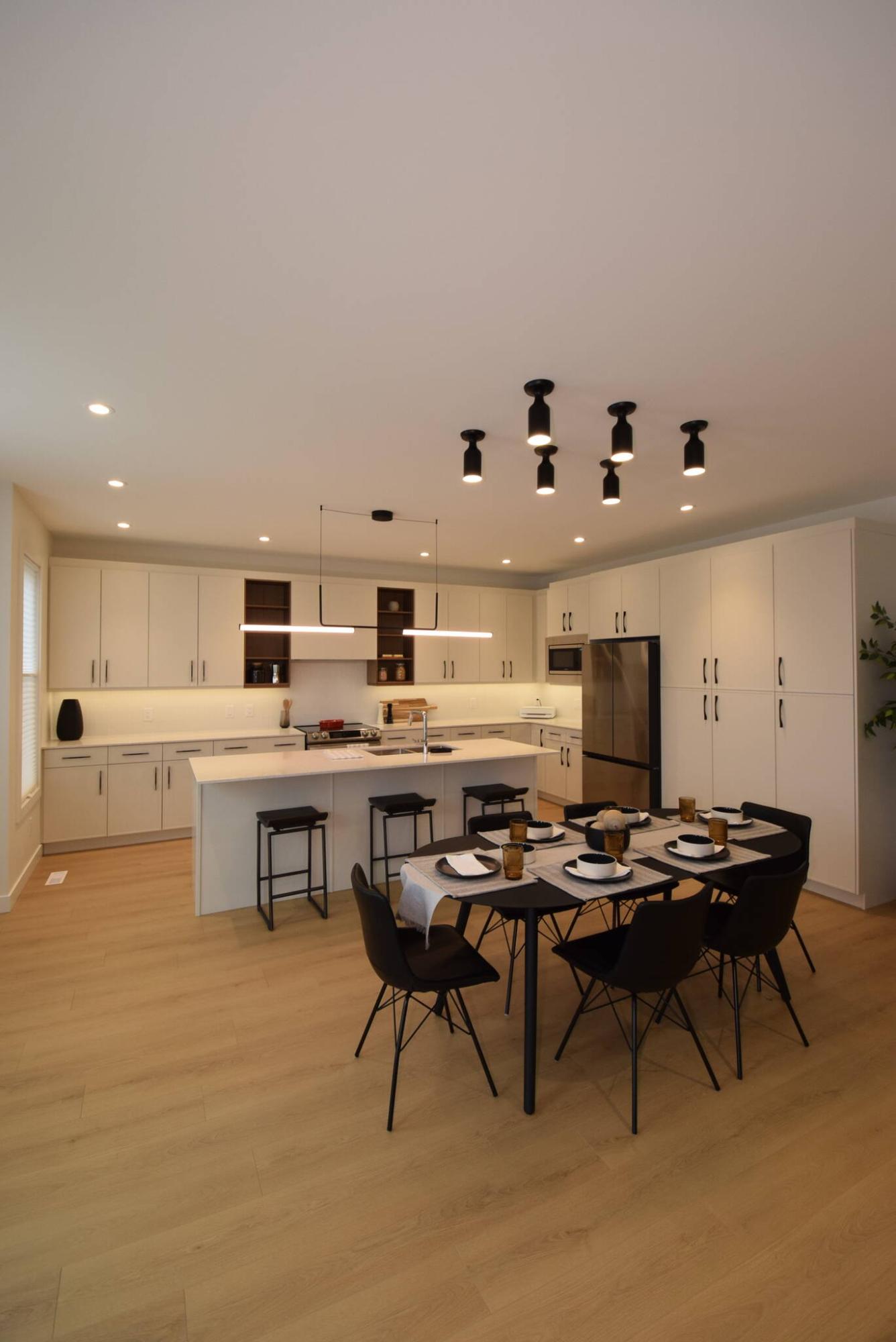 “Each space is incredibly generous in size,” he says. “Just look at the size of the kitchen. It’s a comfortably elegant space that’s anchored beautifully by a huge island, and that’s finished tastefully with off-white soft close cabinets, quartz countertops, a gorgeous tile backsplash and stainless appliances that go perfectly with the modern colour scheme.”