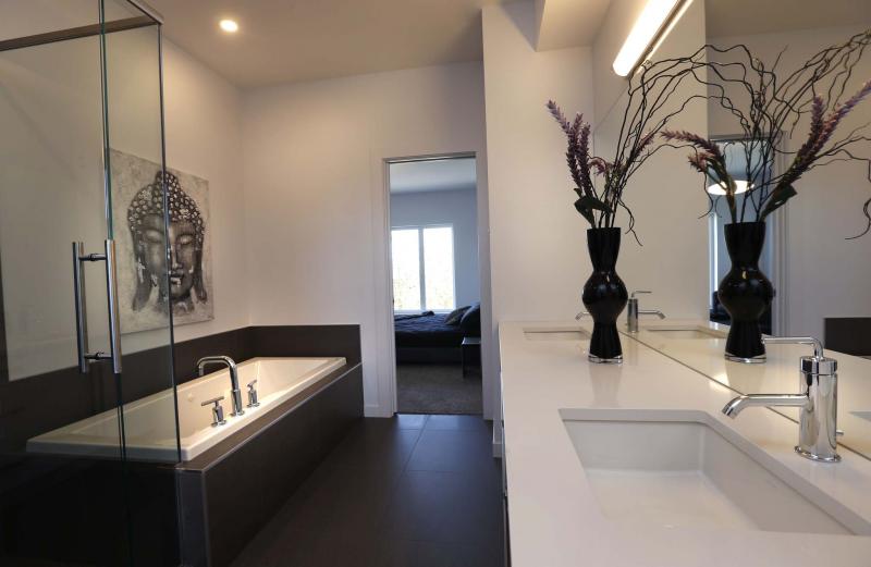 The ensuite bathroom is loaded with double sinks, jetted soaker-tub and walk-in glass shower.