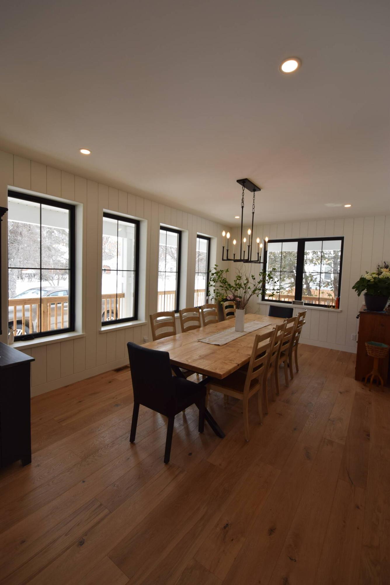 “Again, the dining room has a wall of big windows that let in lots of natural light. Not only that, but the table is made from timber from a spruce tree that was taken down during construction. And the sliding barn door that can be used to close off the mudroom is the old front door.”