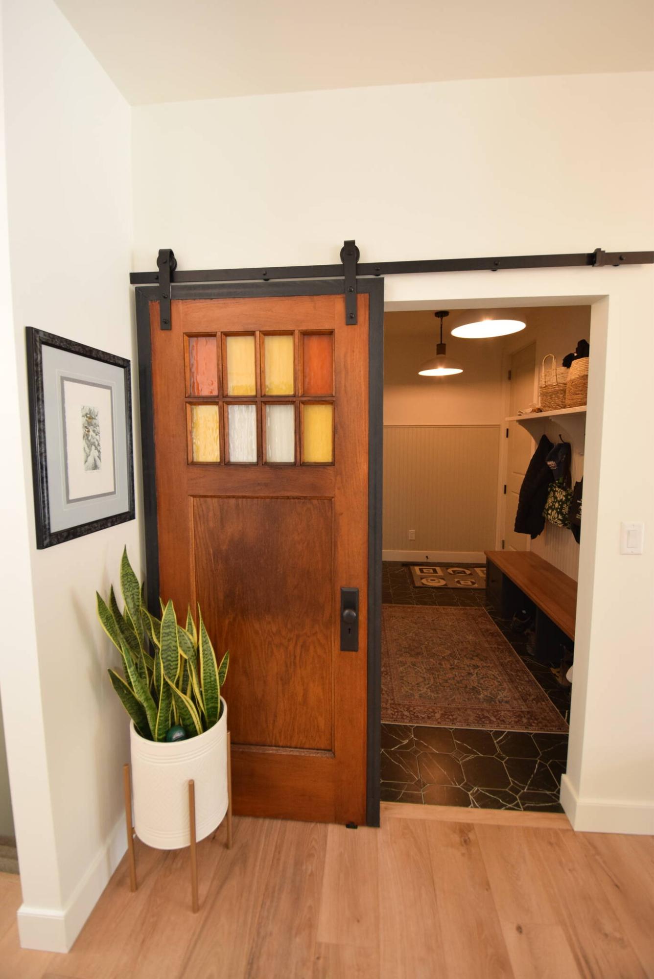 The original home’s front door was reclaimed and used as a sliding barn door that can close off the mudroom in rich, yesteryear style.