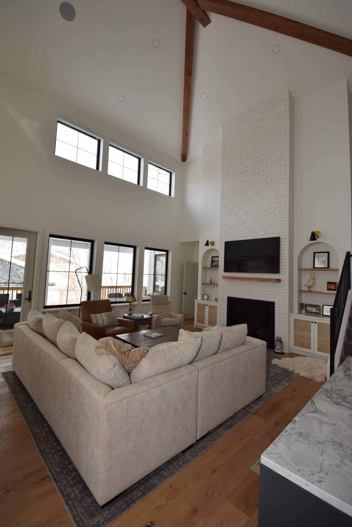 “While its 22-foot-high beamed ceiling is stunning, it also serves a purpose. We placed energy efficient tri-pane windows up high on both the rear wall and side wall, plus large windows down low on the family rooms rear wall. The windows allow for passive solar heating that warms the area up in the winter. In the last month or so, the owners have hardly had to heat it.”