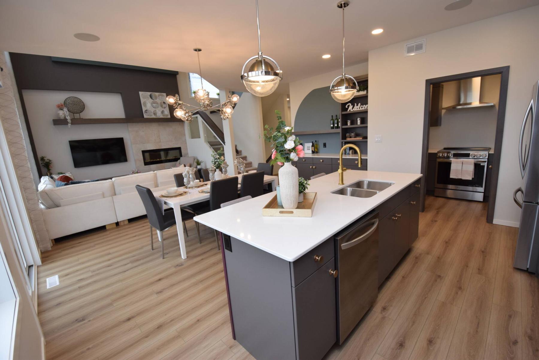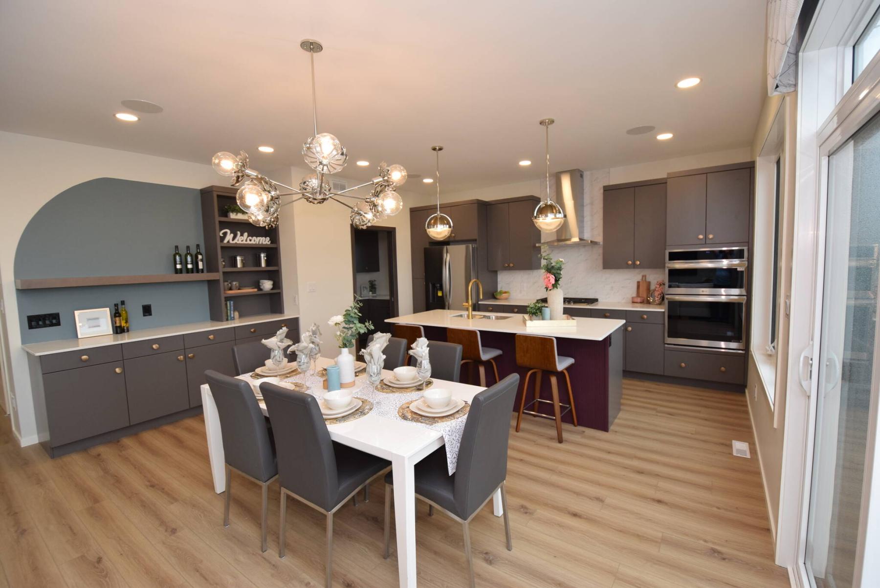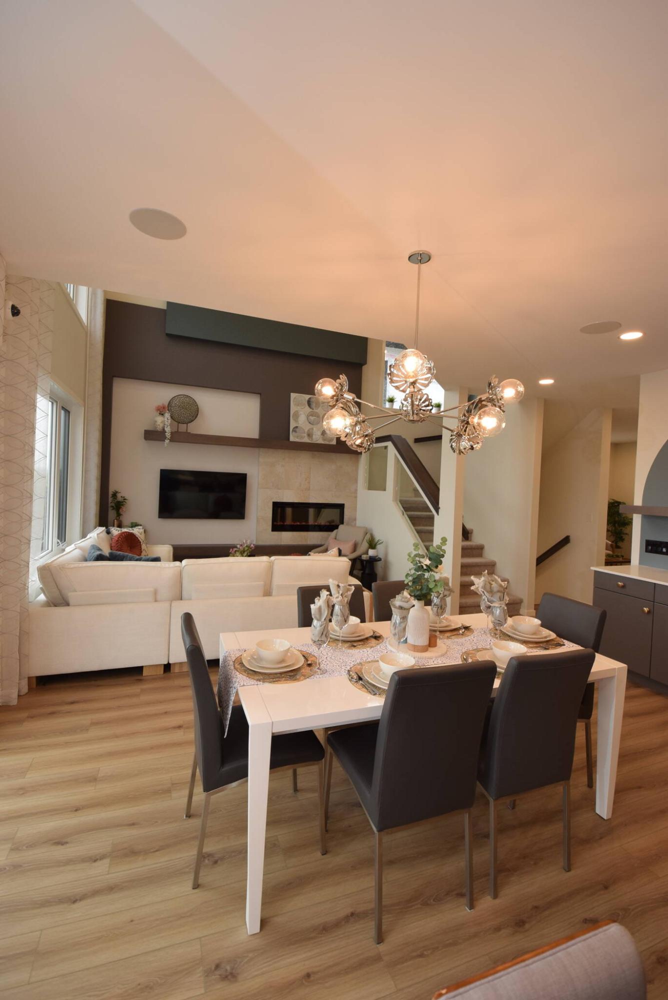 “This is a very popular plan, and it’s easy to see why,” she says of the 2,171, two-storey design. “In this version of the home, it opens up nicely as soon as you step inside. The foyer has a flex room to the right with dividing wall with a beautiful metal insert that looks great and lets light come through.”