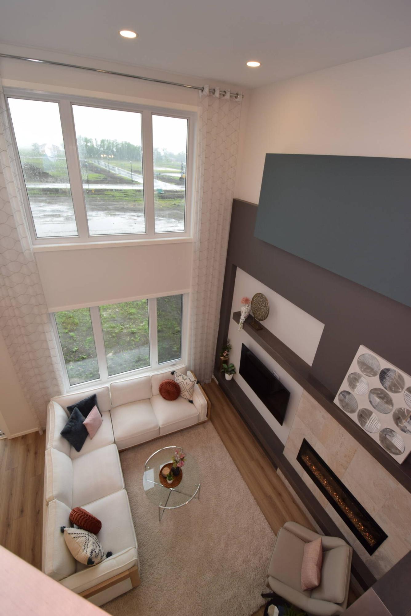 “When you walk in, your eye is immediately drawn to it. Its 18-foot ceiling looks amazing and allowed for the huge floor-to-ceiling windows. It also comes with a gorgeous custom entertainment unit with a linear electric fireplace and wonderful three-tone feature wall that climbs up the wall above.”
