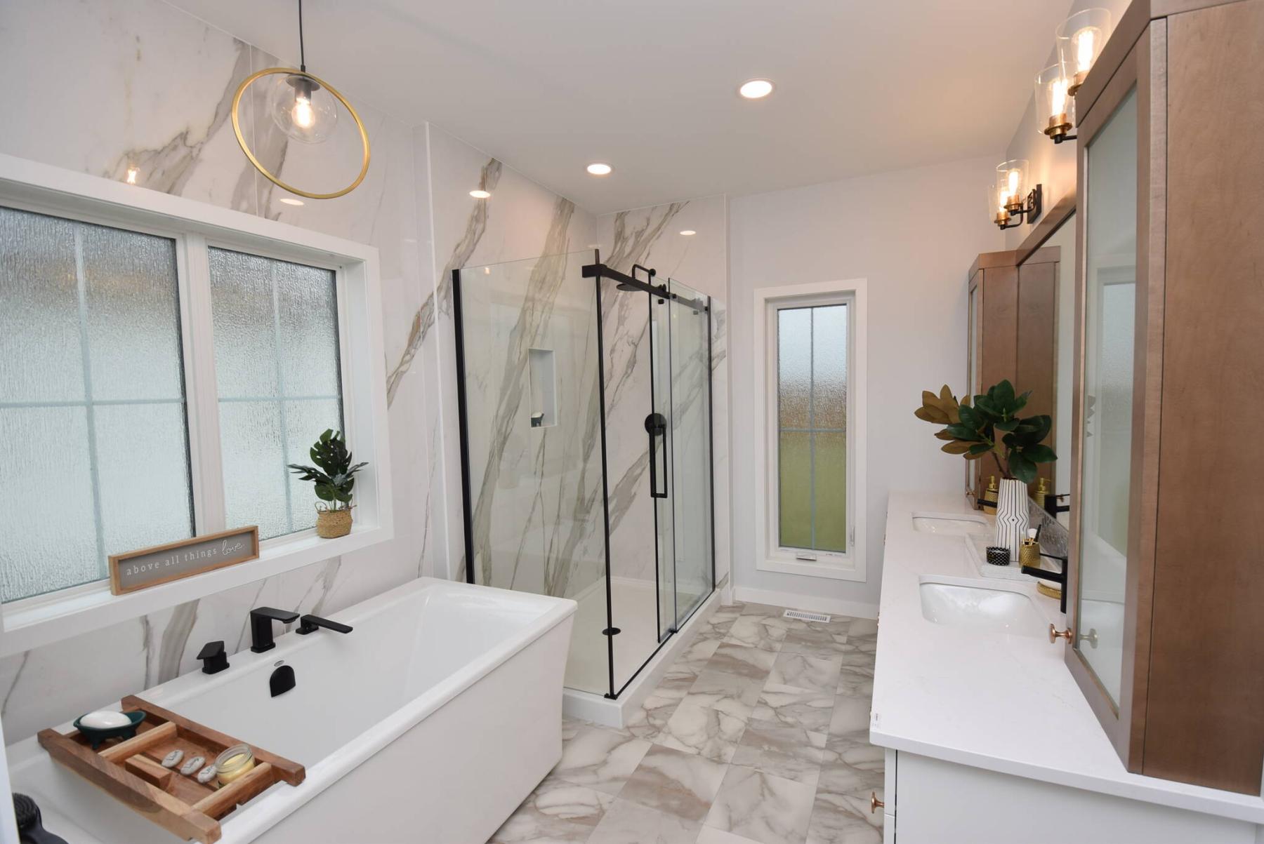 “Just look at the bedroom, it has a tray ceiling and another wall of windows,” she says. “The en suite, which can be closed off by a barn-style door, offers a free-standing soaker tub, walk-in shower with quartz slab surround, warm vinyl tile floor and white vanity with dual sinks. There’s also a huge walk-in closet with tons of built-in storage.”