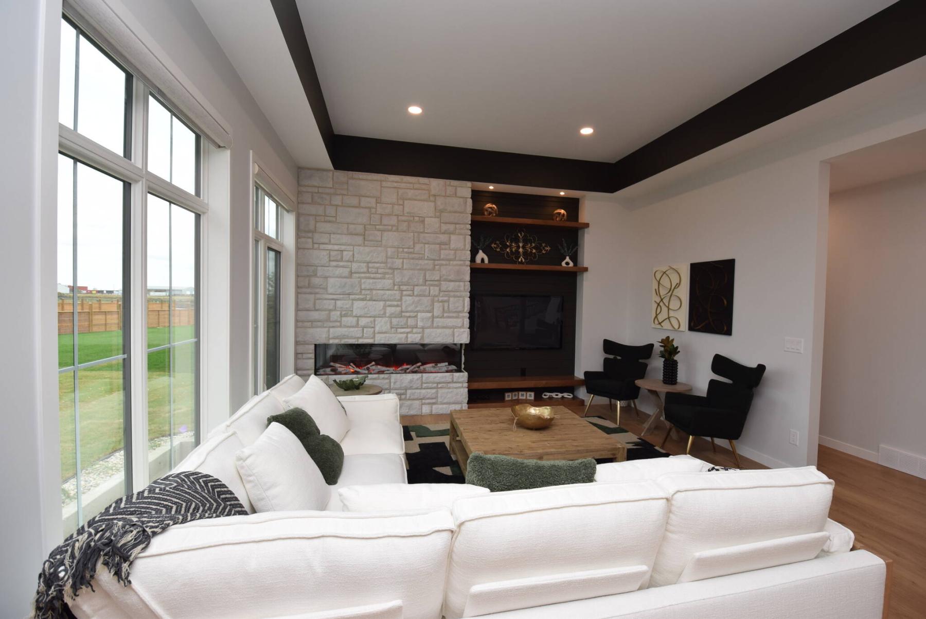“The Tyndall stone feature wall surrounding the linear electric fireplace just makes the space. It’s a cozy, welcoming space that’s defined beautifully by a gorgeous, 11.5-foot-high tray ceiling.”