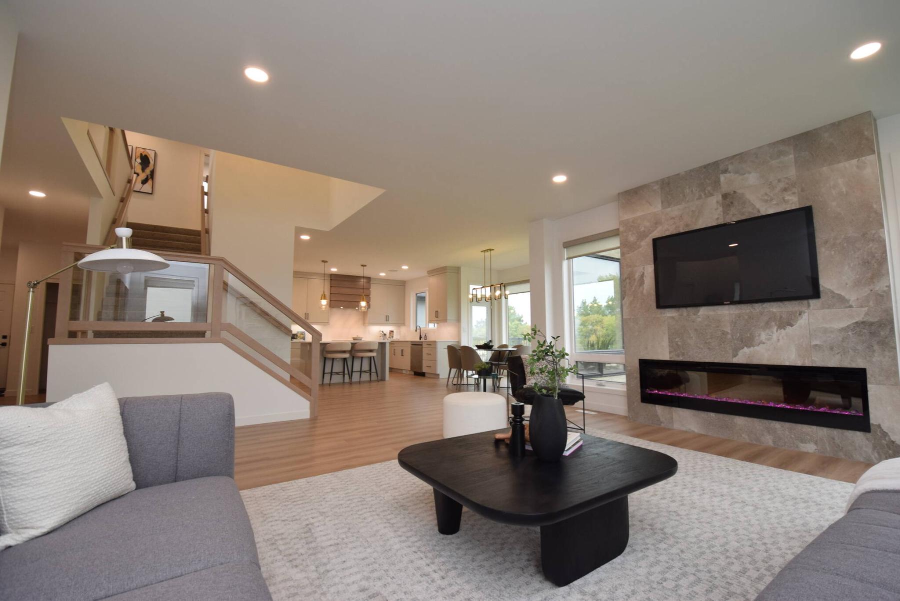 “The result is a wonderful combination of function and modern luxury,” Fazekas says. “There’s lots of room to move, the finishes are gorgeous, and all the large windows do a great job of bringing the breathtaking views inside, especially in the great room, which is finished off perfectly by that amazing, tiled feature wall and its spectacular linear electric fireplace.”