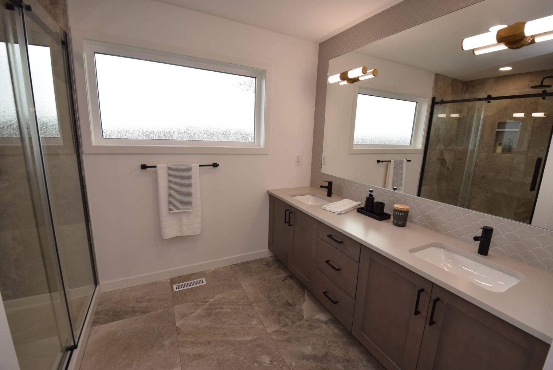 “Natural light pours inside through a big window of a spacious loft that starts off the upper level. It also has a tempered glass insert in the railing that allows you to look down to the main floor,” says Fazekas. “Both secondary windows are huge with massive windows and are set well away from the primary bedroom for privacy. There’s also a large laundry room, too.”