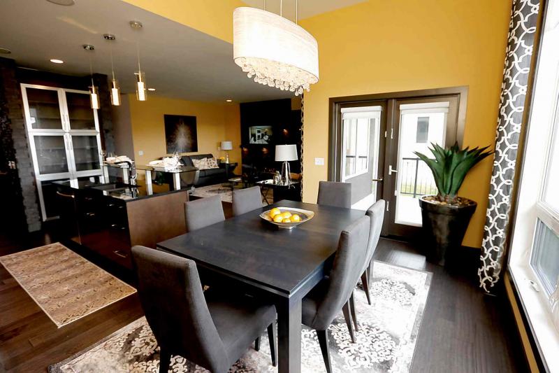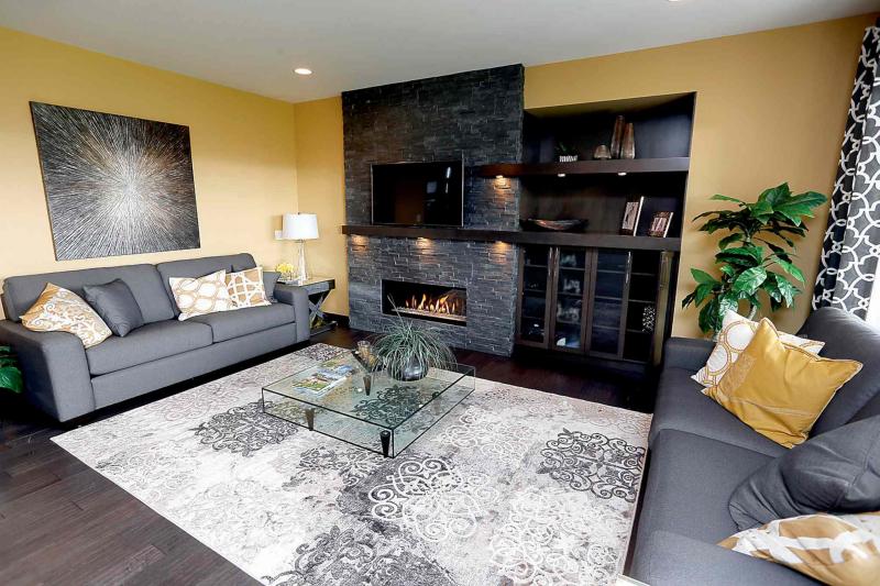 "I think the designers did a nice job of contrasting the colours -- the walls pop, yet are still warm. At the same time, there's lots of functional space. There's room for a table for six to eight in the dining area, seating for two to three at the raised breakfast nook off the (10-foot black quartz) island, and the family room -- its focal point is its cultured stone, ribbon-style gas fireplace - offers plenty of room to configure furniture just as you'd like it."