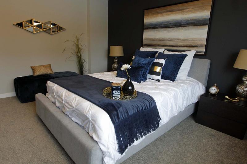 The bedroom wing — which features an art niche at its mid-point between the master suite and secondary bedrooms — is then finished off in fabulously functional style by a master suite that’s well, simply grand, Joelson says. "It has everything you’d want in a master suite: a vaulted ceiling, huge window — for loads of natural light — tons of space, which is amplified by a cantilevered wall with grey background that allows the bed to be set back a foot or two to open up room to move, his/hers walk-in closets and an elegant ensuite with heated (taupe) tile floor, low-step-over glass/tile shower and (portobello) maple vanity with dual sinks."