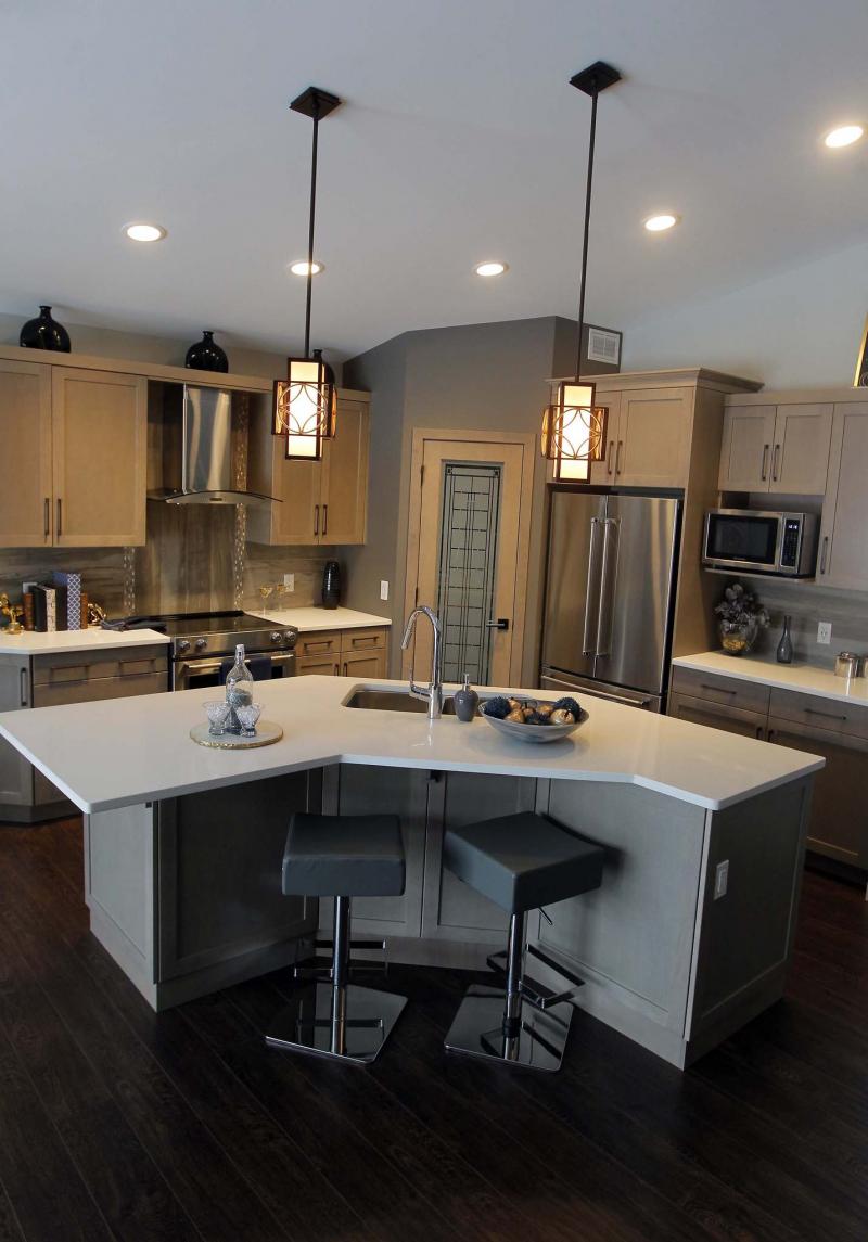 The kitchen of 39 Diamond Dust Dr. in Sage Creek features a large, angled island that has seating for two.