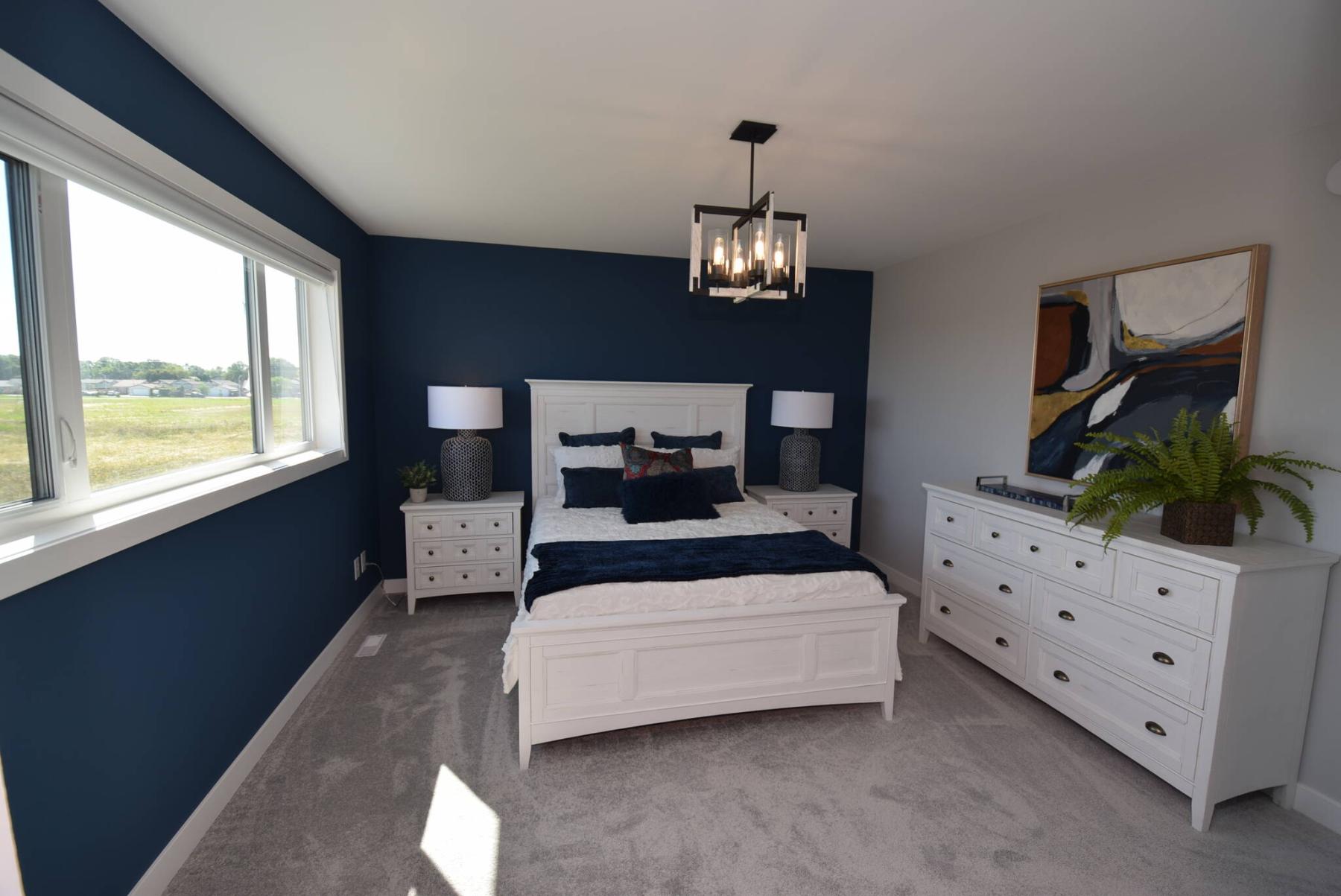 Tons of natural light flows into the spacious primary bedroom through a huge window on its rear wall, while a midnight blue and grey colour palette creates a calm, relaxing feel.