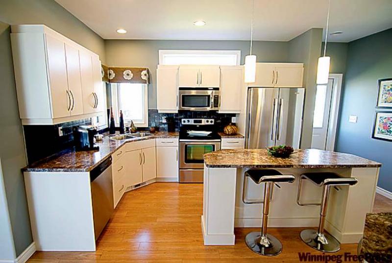 Finishing quality is excellent, with wide-plank oak laminate floors, black/brown/copper laminate countertops that resemble granite and white cupboards that pop nicely off the background provided by walls painted in a warm blue/grey hue.