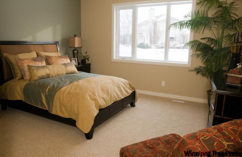 Placed off the great room well away from the other bedrooms, the bright master bedroom can be accessed quickly. A large window lets light flow in, while ample space allows for placement of all the necessary bedroom accoutrements, including a reading chair. Meanwhile, the ensuite is, well, quietly luxurious thanks to a huge jetted tub and glass shower enclosure with beige ceramic surround.