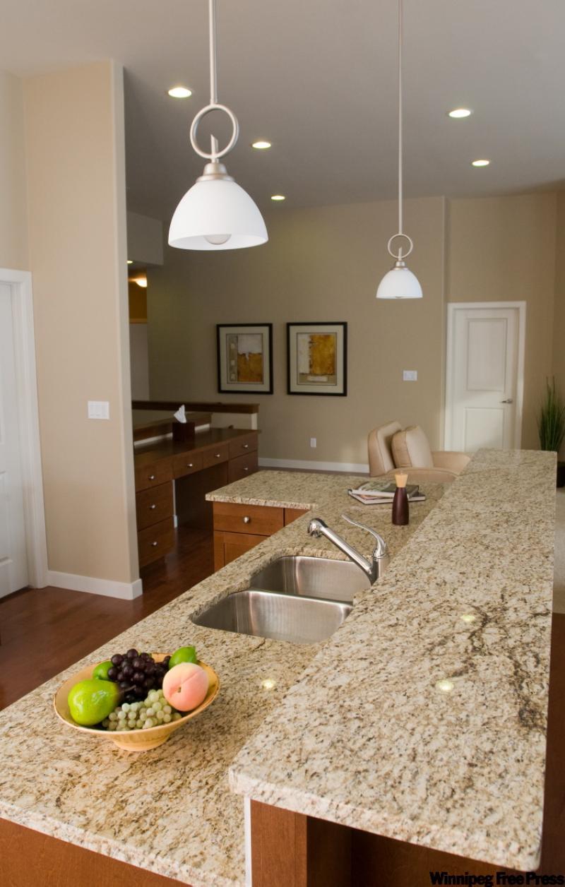 To balance out the bright great-room interior, A & S's designers choose a colour palette of rich brown and beige earth tones: caramel cabinetry and (maple) hardwoods, tan and dark brown paint, a beige ceramic backsplash and beige/brown granite counter tops.