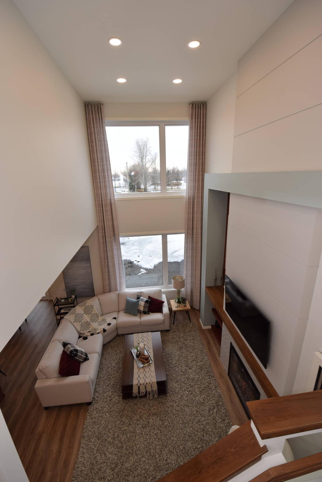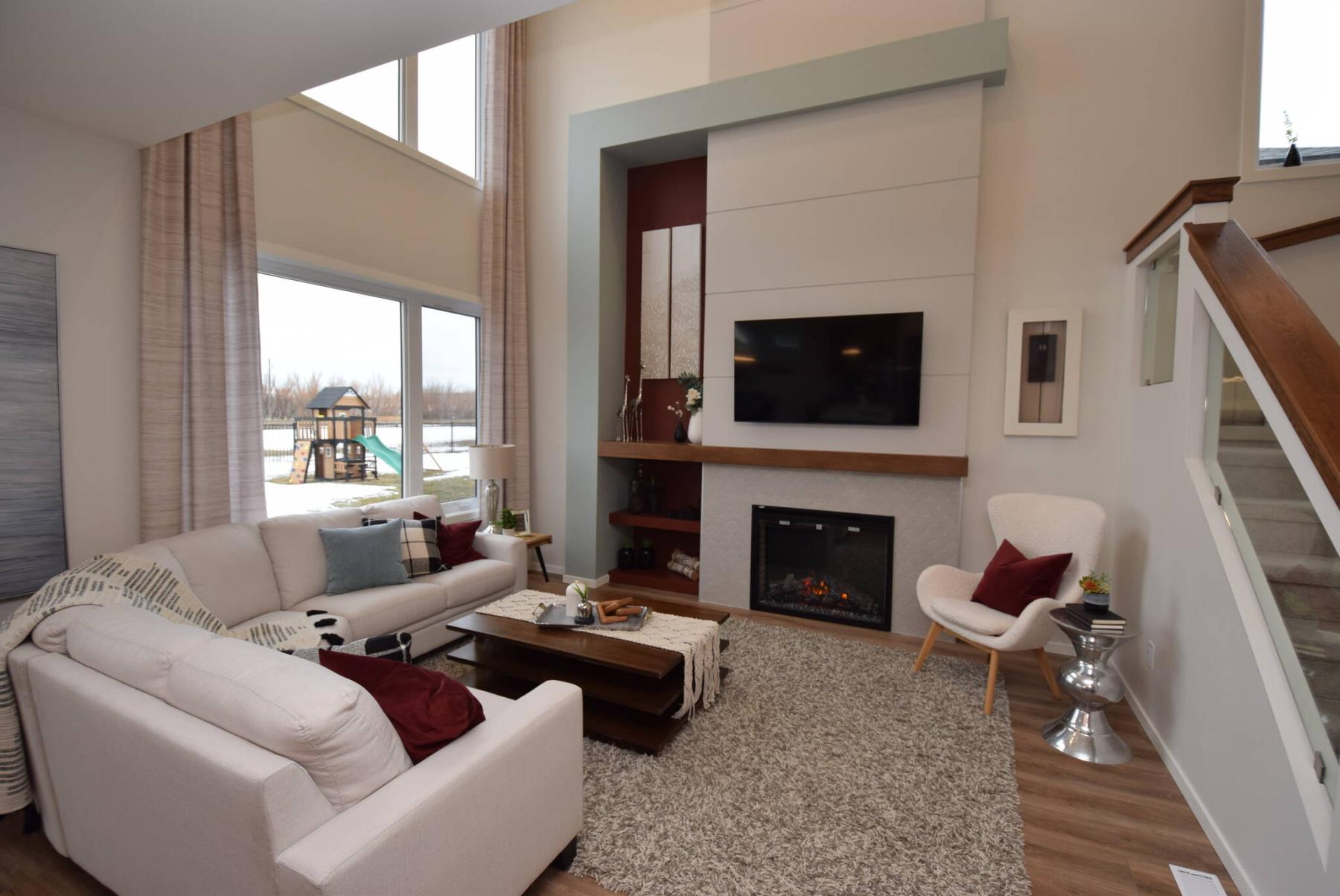 “It’s absolutely spectacular with its 18-foot ceiling, floor-to-ceiling windows, and a gorgeous entertainment unit with an electric fireplace with tile surround, TV nook above and a drywall stack that goes all the way up to the ceiling. The warm tones on the mantel, in the storage space and on the stairwell capping work with the flooring to create a wonderful, inviting feel.”