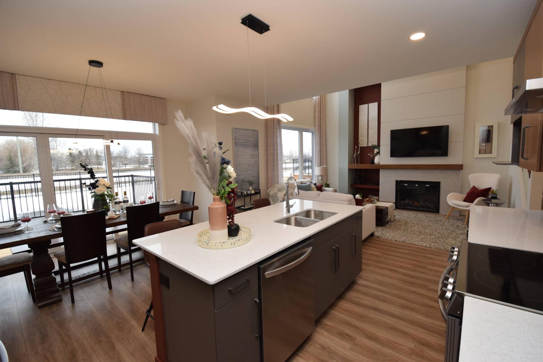 “It opens up perfectly into a big, wide-open space that holds three wonderful spaces that are distinct, yet accessible,” says Garry Loewen, Dudeck’s sales partner. “Because the area faces south, it’s super bright. Daylight flows in all day long through a triple patio door behind the dining area and floor-to-ceiling windows in the family room.”