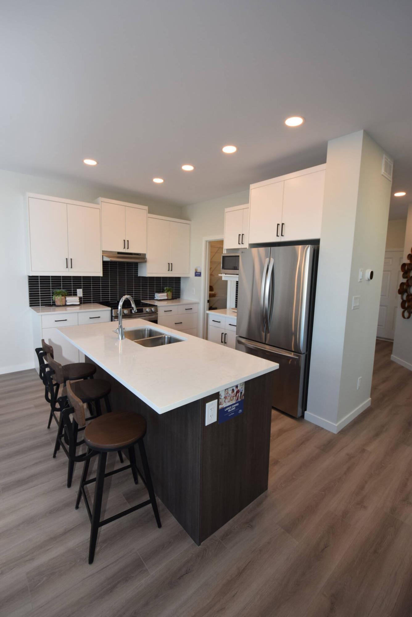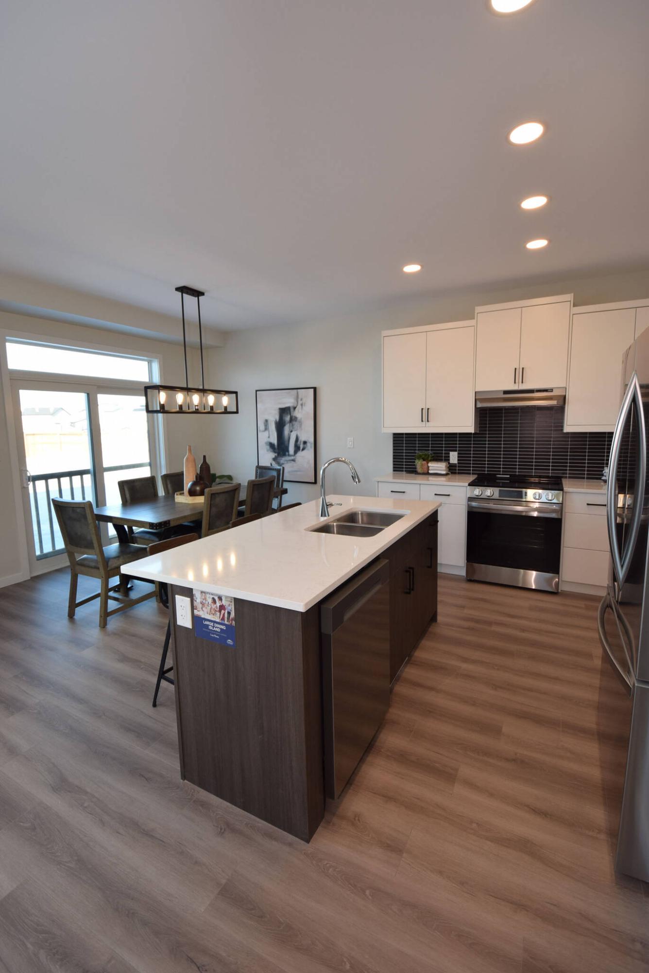 Contemporary style and utility abound in the island kitchen in Randall Homes’ spacious Canterbury Crossing two-storey design thanks to contrasting finishes and tons of space in which to create.