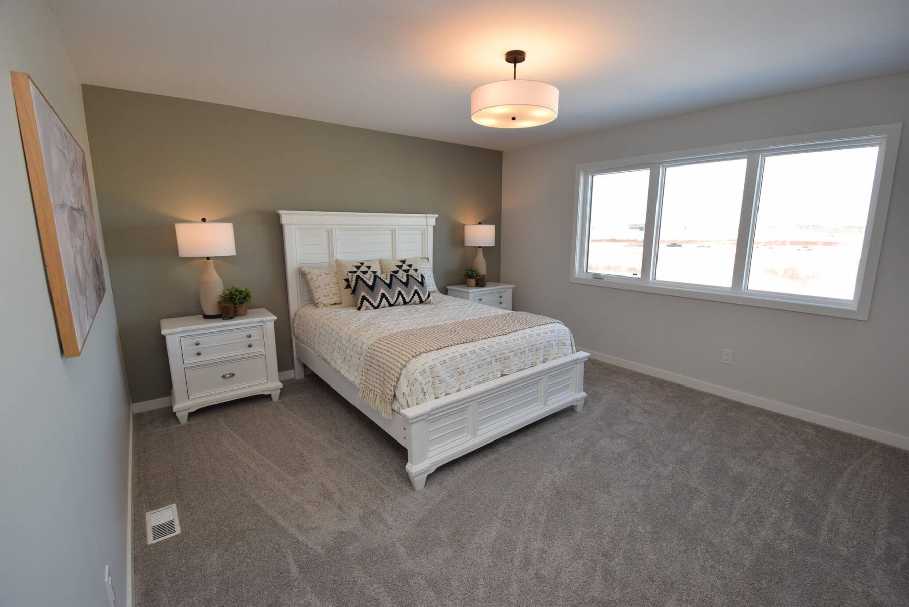 The naturally bright primary bedroom possess an air of tranquility thanks to a calming earth-tone colour scheme.