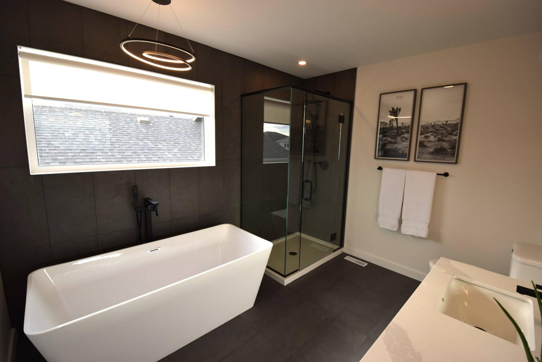 The long hallway isolates it perfectly,” says Chen. “Tons of light comes in from two sides — a large window on its rear wall, and a patio door on its left-hand wall. There’s also a big walk-in closet and a beautiful ensuite with a free-standing soaker tub and walk-in shower that has the same charcoal grey tile surround as the bathtub.”