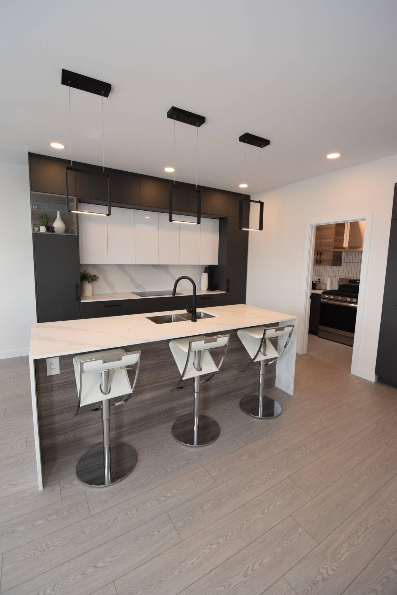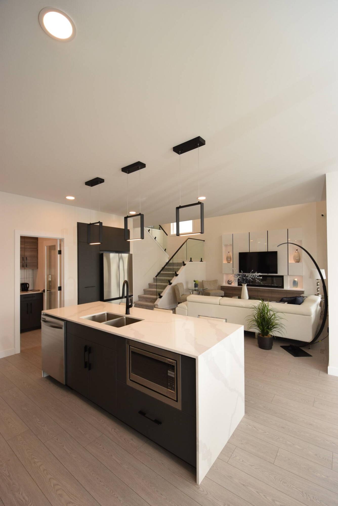 “It is centred around an optional entertainment unit with an electric linear fireplace that was placed beneath a TV area with glossy white paneling that matches the cabinets in the kitchen. Walnut-style thermofoil cabinets down low add storage space and texture, and lit display shelving placed up high and down low at either end is a nice finishing touch.”