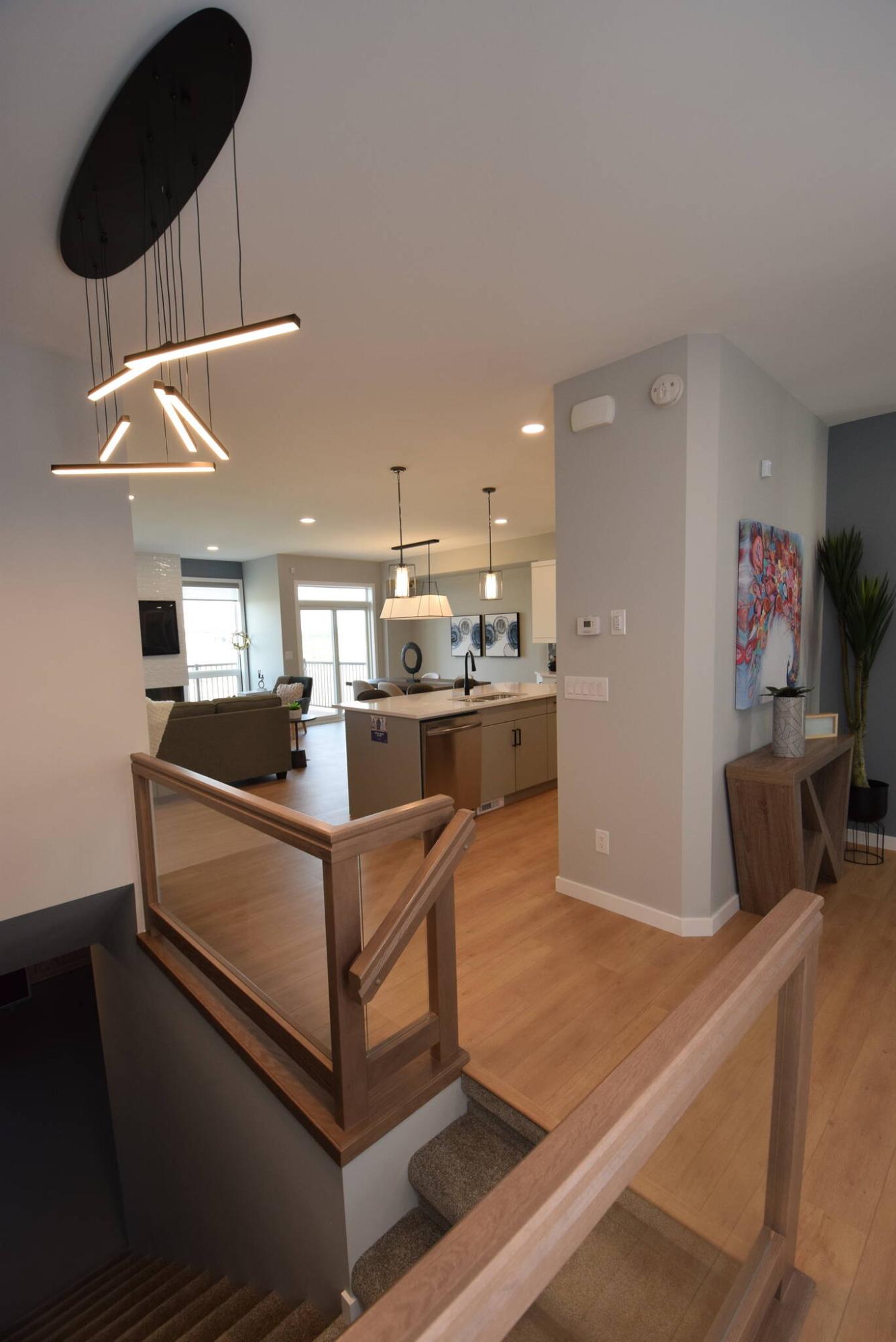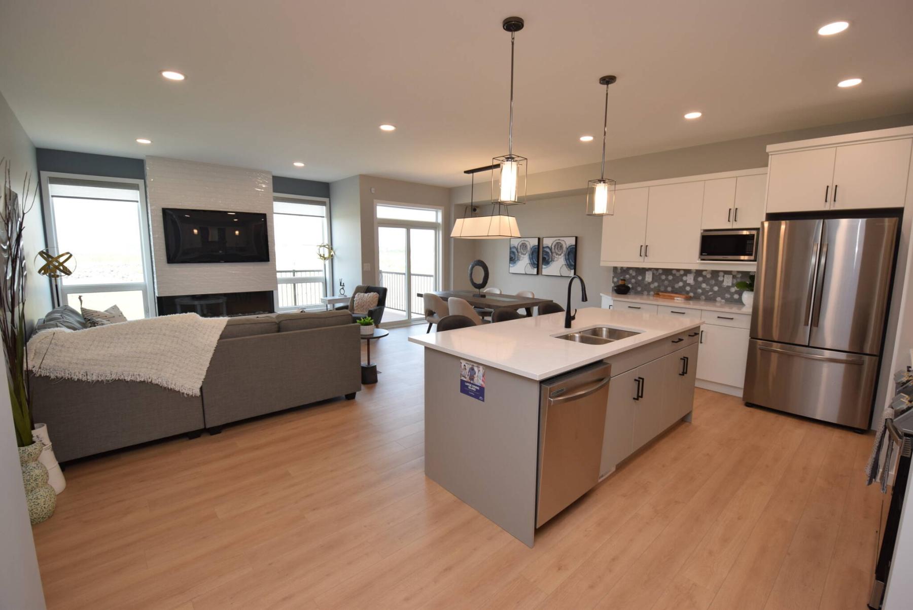 The eating area is roomy, with capacity to seat anywhere from six to 10 guests with ease; the great room — which is centred around a gorgeous white tile feature wall with linear electric fireplace and TV niche — is roomy, yet intimate with ample space for a sofa, loveseat and chair or two.