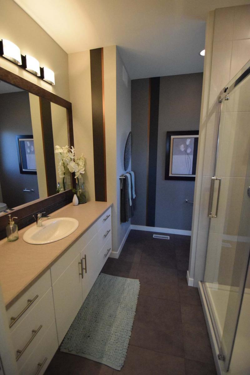 And while 9 Wheelwright — a 1,540-square-foot bungalow is obviously well-appointed (after all, it is a show home), it’s not over the top with its finishes. "We purposely didn’t go crazy with upgrades," Stroud explained. "We wanted to show what you get for a price tag of $499,900 (which includes lot and net GST). You not only get all those standard features included in the price, but you also get granite countertops in the kitchen along with two-tone (light and dark) thermofoil cabinets. High-grade (walnut) laminates run through the foyer and great room, and there’s a cultured-stone gas fireplace with oak mantel in the family room."