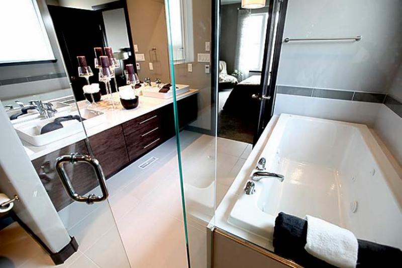 “The bedroom is a good size and has a large window that gives you a nice view of the backyard and creek,” Marks said. “And the spa-like ensuite is quite luxurious with its (off-white) heated tile floor, six-foot jetted soaker tub (set in the same tile), four-foot shower (with tile surround, glass front and two body sprays) and floating maple/quartz vanity with dual Kohler sinks (a Maric trademark). The ensuite was placed at the end so one partner can shower and get dressed for work without disturbing the other.”
