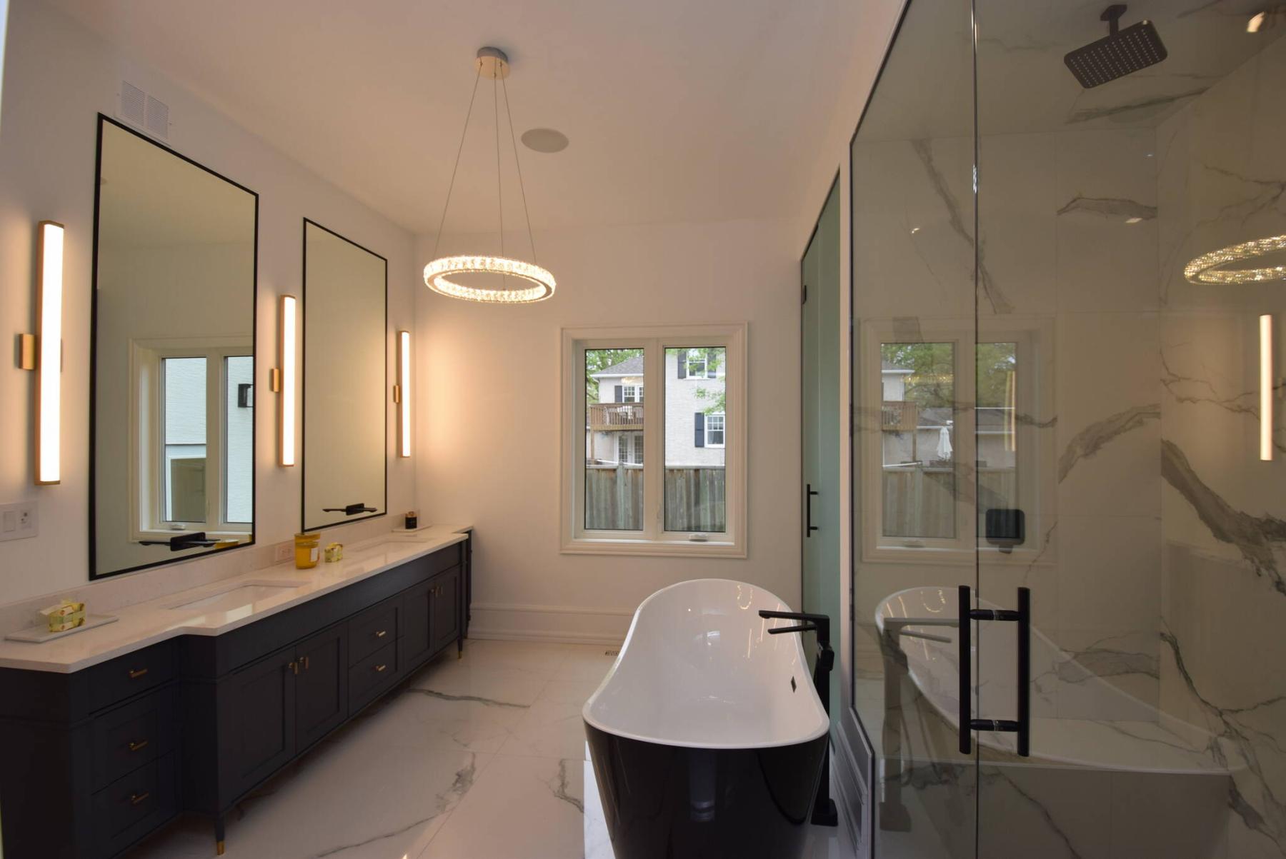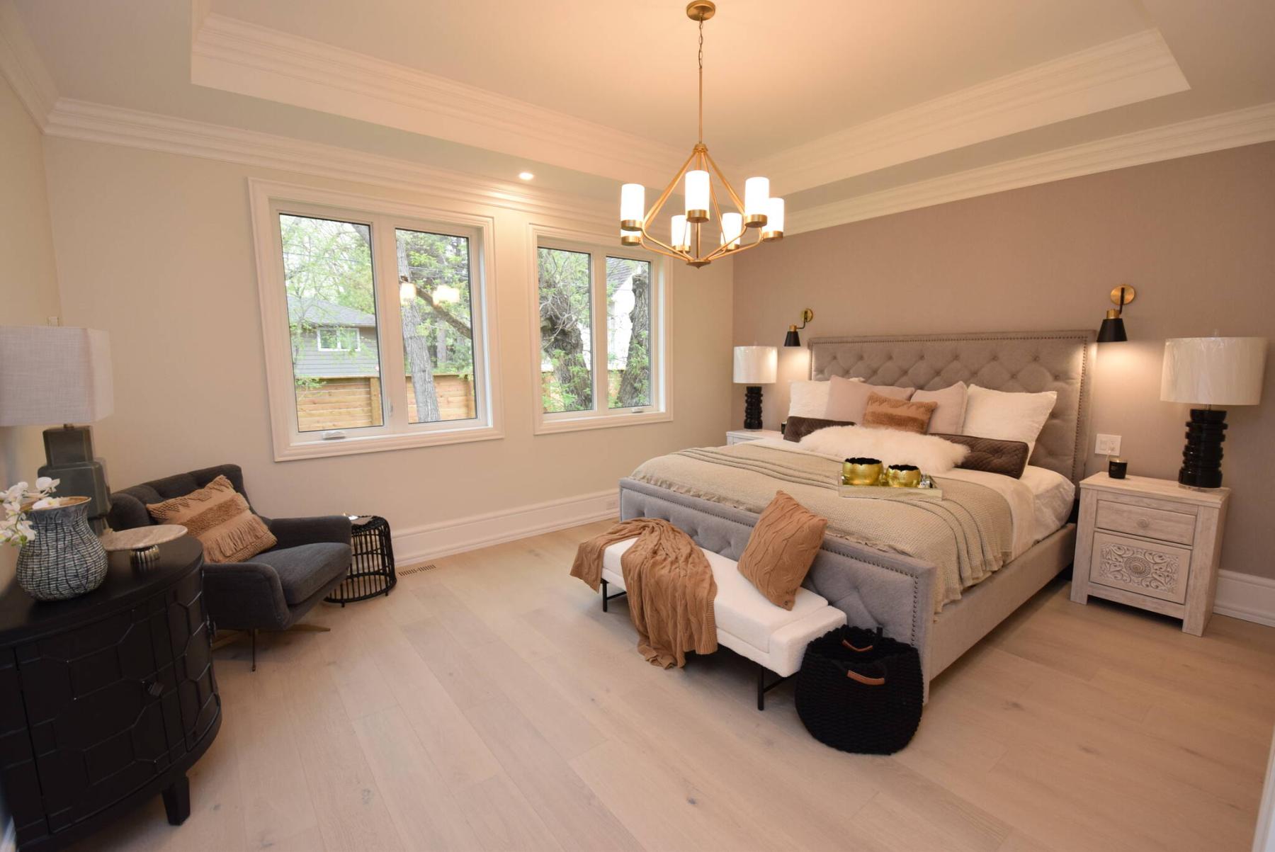 “With its tray ceiling and abundance of natural light, it’s an amazing space,” says Reimer. “The spa-like ensuite is pure luxury with heated porcelain tile floor, a stand-alone soaker tub, gorgeous walk-in shower with heated floor and seats, custom vanity with dual sinks and white quartz countertop and an enormous walk-in closet with custom-built storage.”