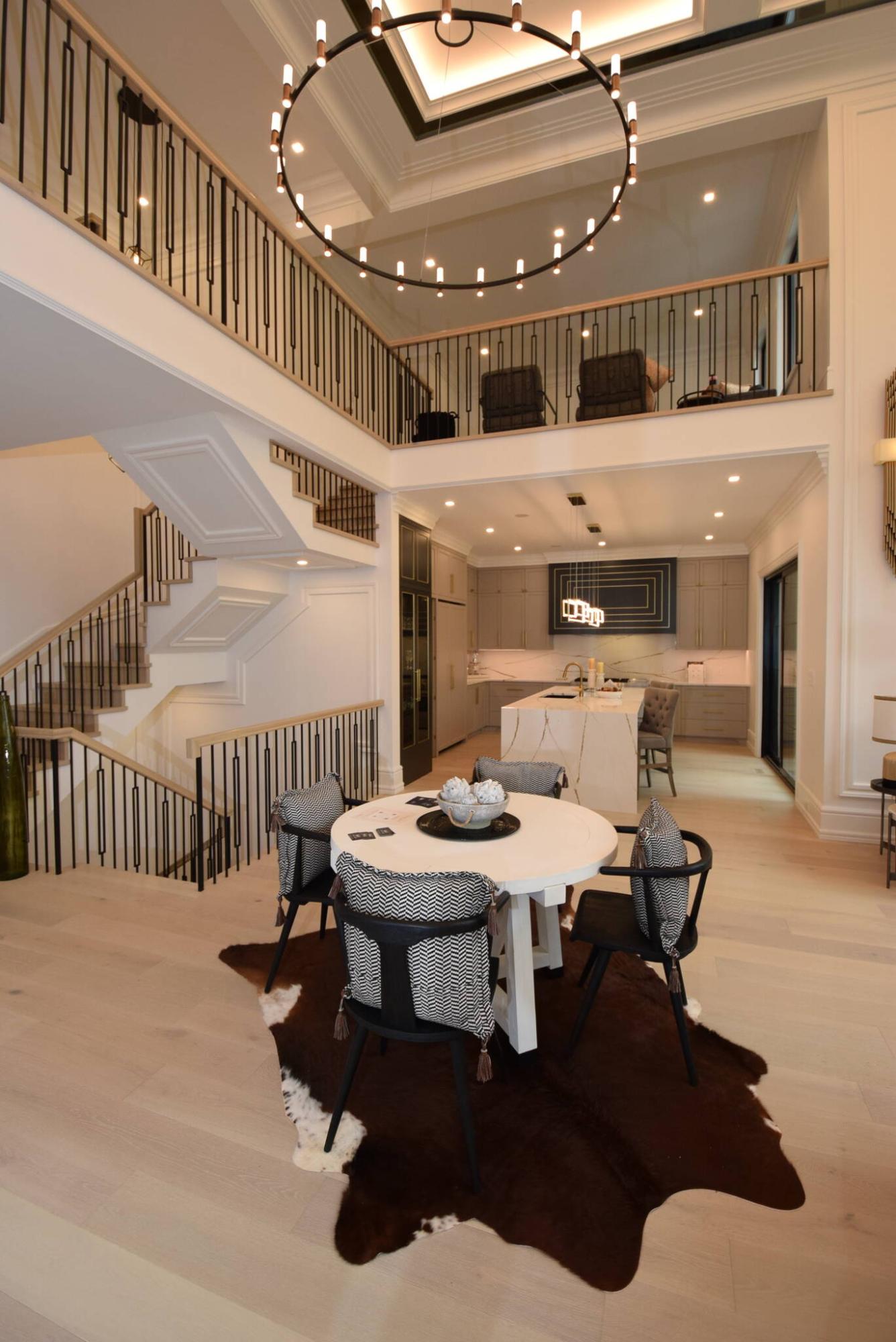 “Its focal point is a book-matched marble feature wall that serves as a stunning backdrop to a custom-made wine display with in-floor lighting. There’s also an amazing, coffered ceiling with LED chandelier and tall windows that let in loads of natural light. The foyer and dining room start the home off perfectly.”