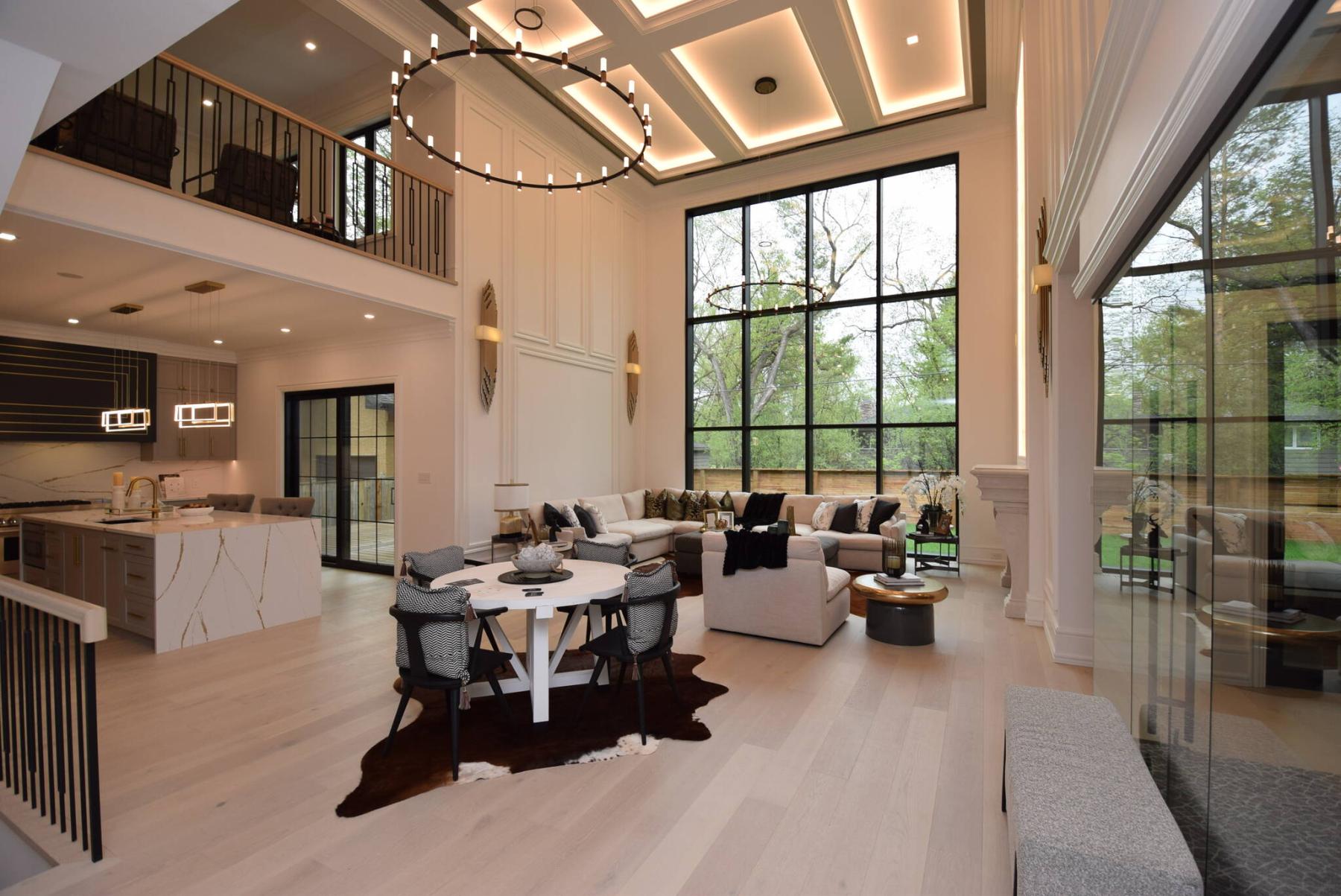 “There’s just so much to take in at once – a soaring 20-foot ceiling, beautiful, engineered white oak hardwood floors and finer details like 10-inch baseboards and custom, one-of-a-kind brass light fixtures,” Reimer says. “The entire area is open to above, and a massive curtain wall window on the rear wall provides backyard views and an endless amount of natural light.”
