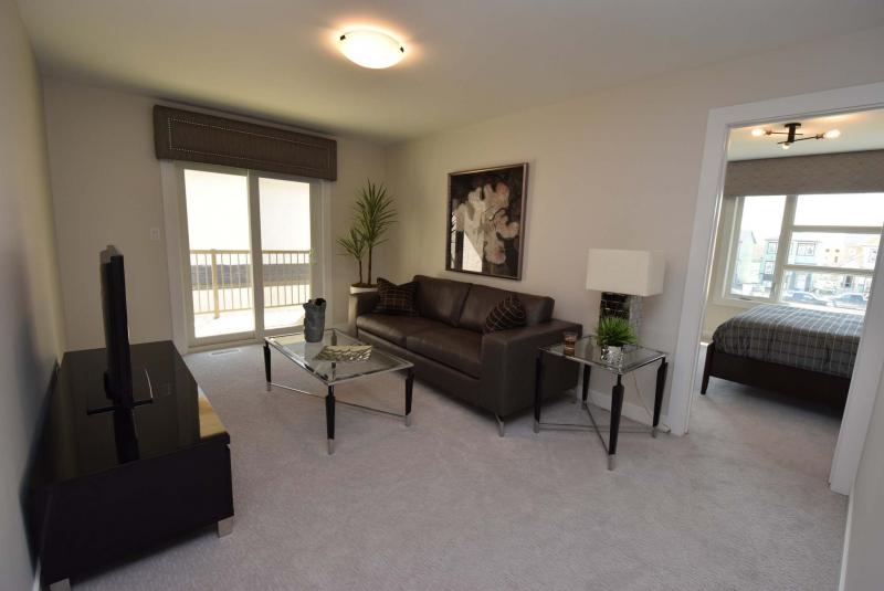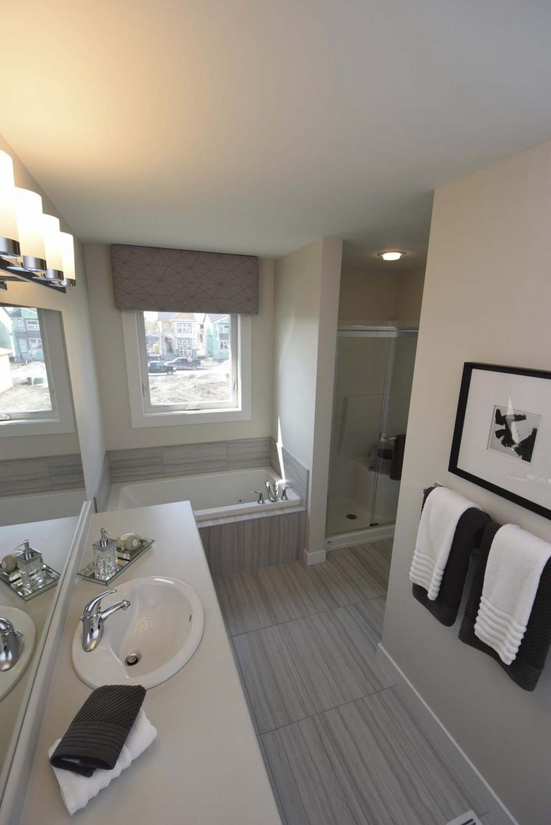 "It’s a big, super-bright space," Curtis says. "The light not only comes in through a huge picture window, but also from a piano window over the sitting area. There’s also a spacious walk-in closet and spa-like ensuite with jetted soaker tub, four-foot glass/tile shower, walnut veneer (thermofoil) vanity and gorgeous grey/white ceramic tile floor that imitates limestone."