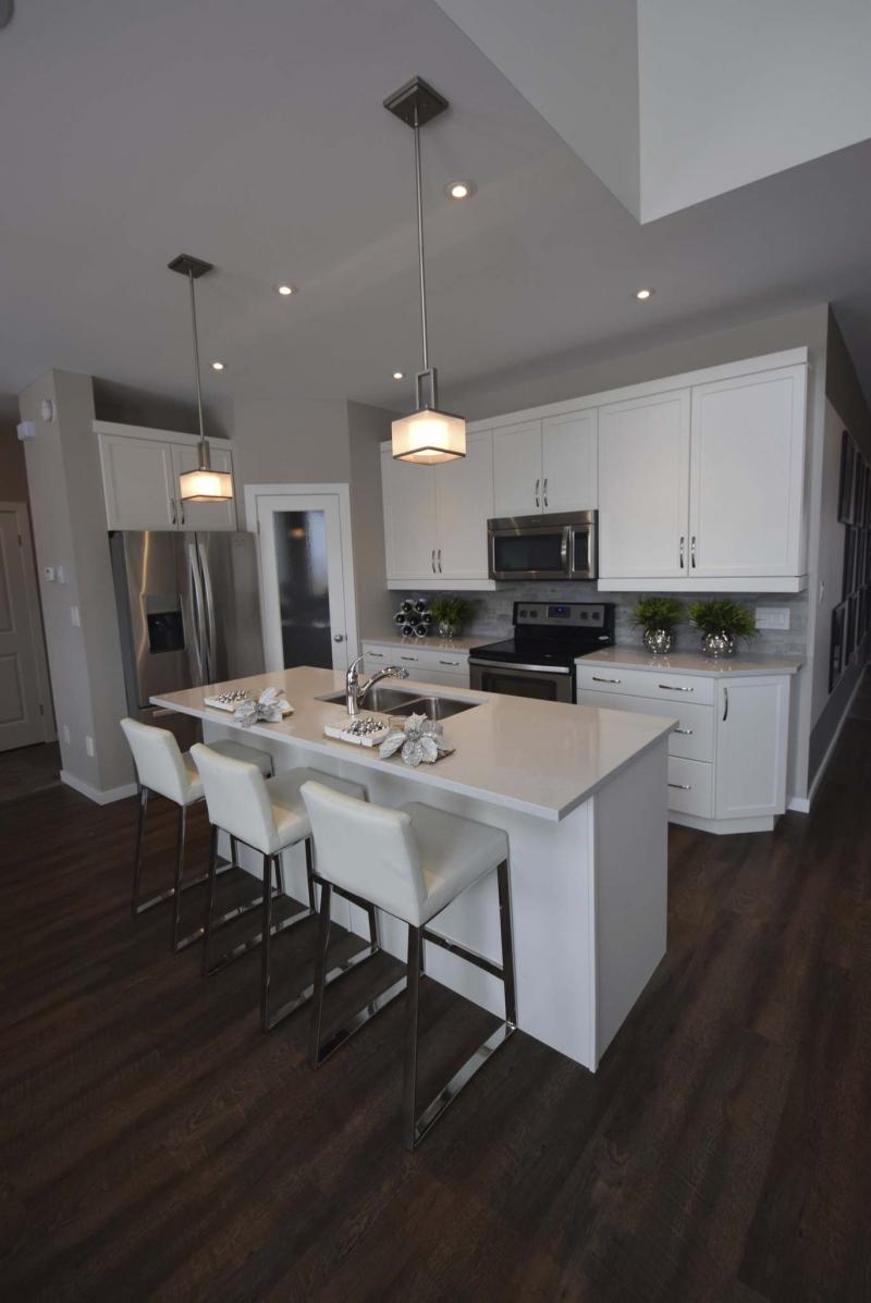 "I love the finishes. The vinyl plank flooring looks like the real thing with its distressed look and warm colour — it’s very durable, too," she says. "For this home, our designers went with white thermofoil cabinets (instead of standard maple cabinets) to give the home a more modern look. They go beautifully with the quartz countertops and the tile backsplash."