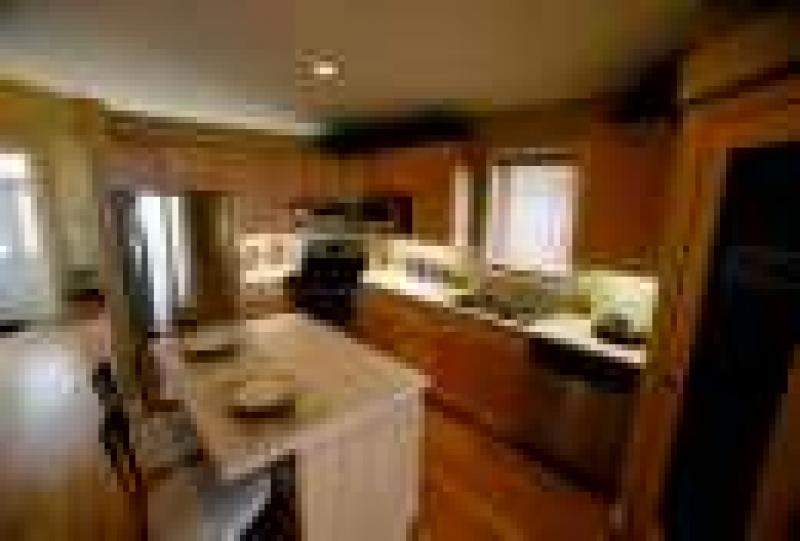 Simply put, the great-room area is an ergonomic dream, with no wasted space; all the key amenities have been placed exactly where they should be. The island kitchen features wide aisles and a compact island preparation area that also seats two; there is plenty of counter and cupboard space (the cupboards are natural maple, the countertops a smart textured beige Arborite) -- plus a bonus: a dinette area for four.