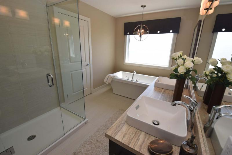 The deluxe ensuite bathroom offers a standalone soaker tub, custom shower and espresso maple vanity with dual sinks.