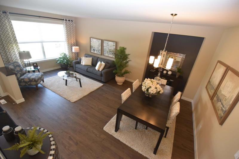 "The paint colours (medium taupe and various shades or brown) make for a warm, inviting feel that starts in the living room/dining room and extends into the great room. Everyone who’s been in the home has also commented about the flooring — a textured wide-plank laminate with walnut finish that’s not only gorgeous, but very durable."