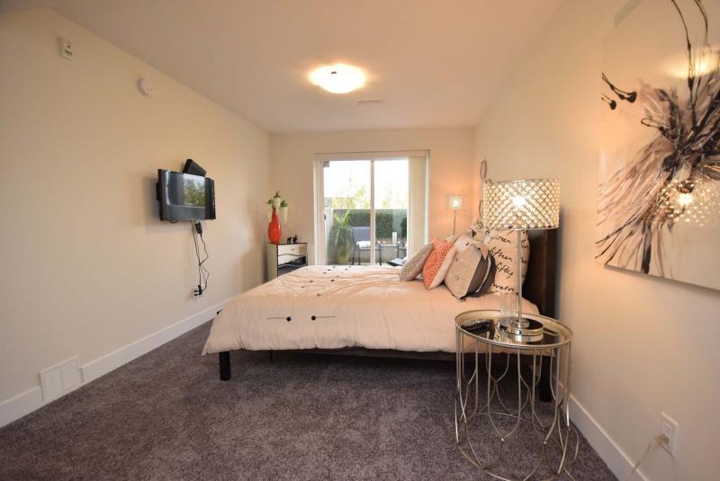 Set off in its own private space at the end of the hallway, the master suite is a revelation. A set of sliding doors on its rear wall provide access to a private, sunken patio, while a doorway on its right-hand wall leads into an enclosed area that houses a huge walk-in closet and three-piece ensuite.