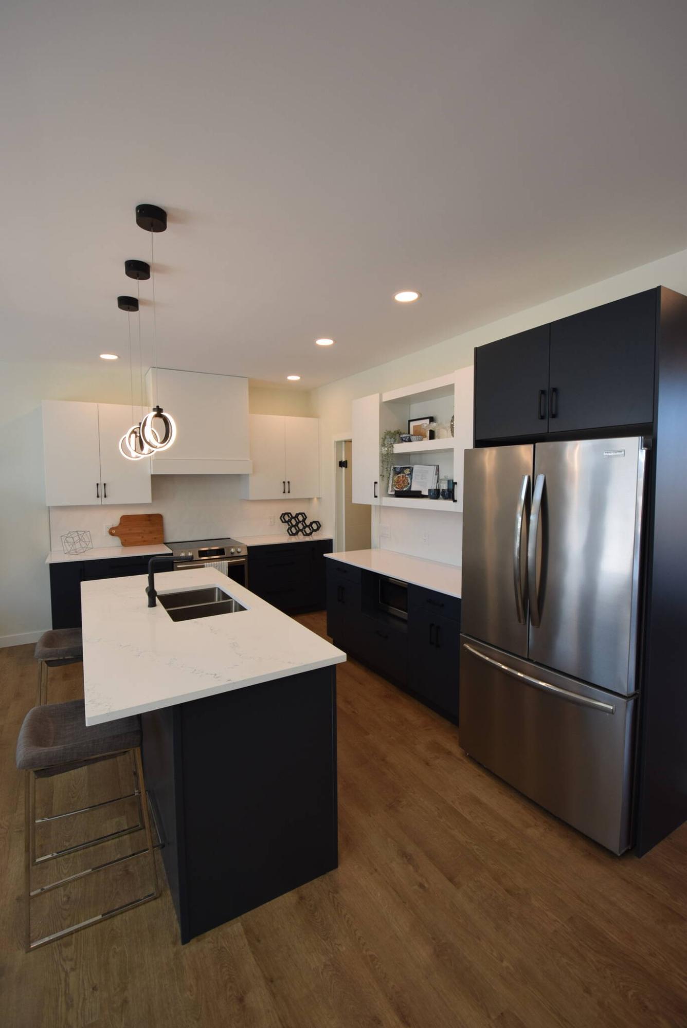 With its well-placed stone accents, grey siding, black-trimmed windows and clean, linear silhouette, the 2,046-sq.-ft., two-storey home possesses a modern, understated elegance.