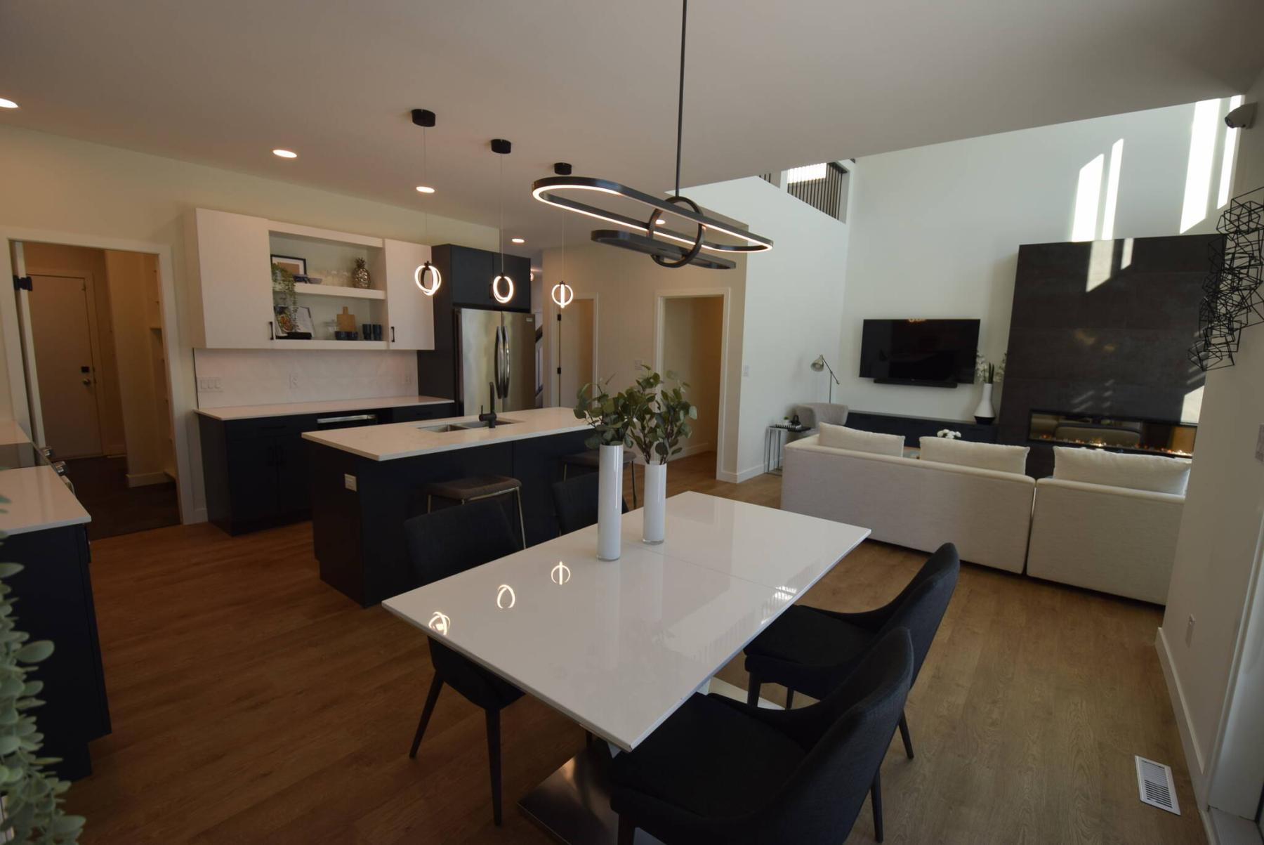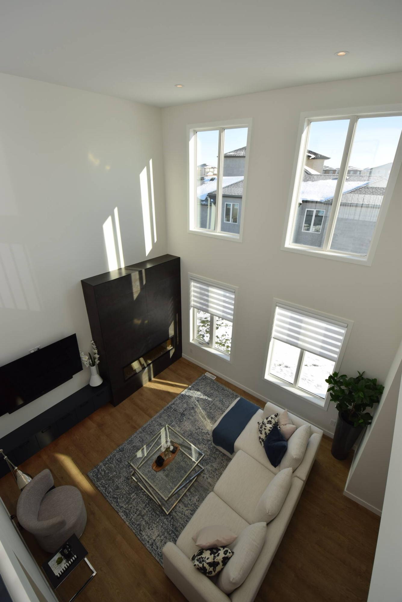 “It’s just a very appealing space. It starts with its double-high ceiling, which allowed for huge floor-to-ceiling windows. A linear electric fireplace set in grey tile gives it classic style, while a huge TV nook adds function. I love how the high-end laminate plank flooring finishes it off with its warm, textured look.”