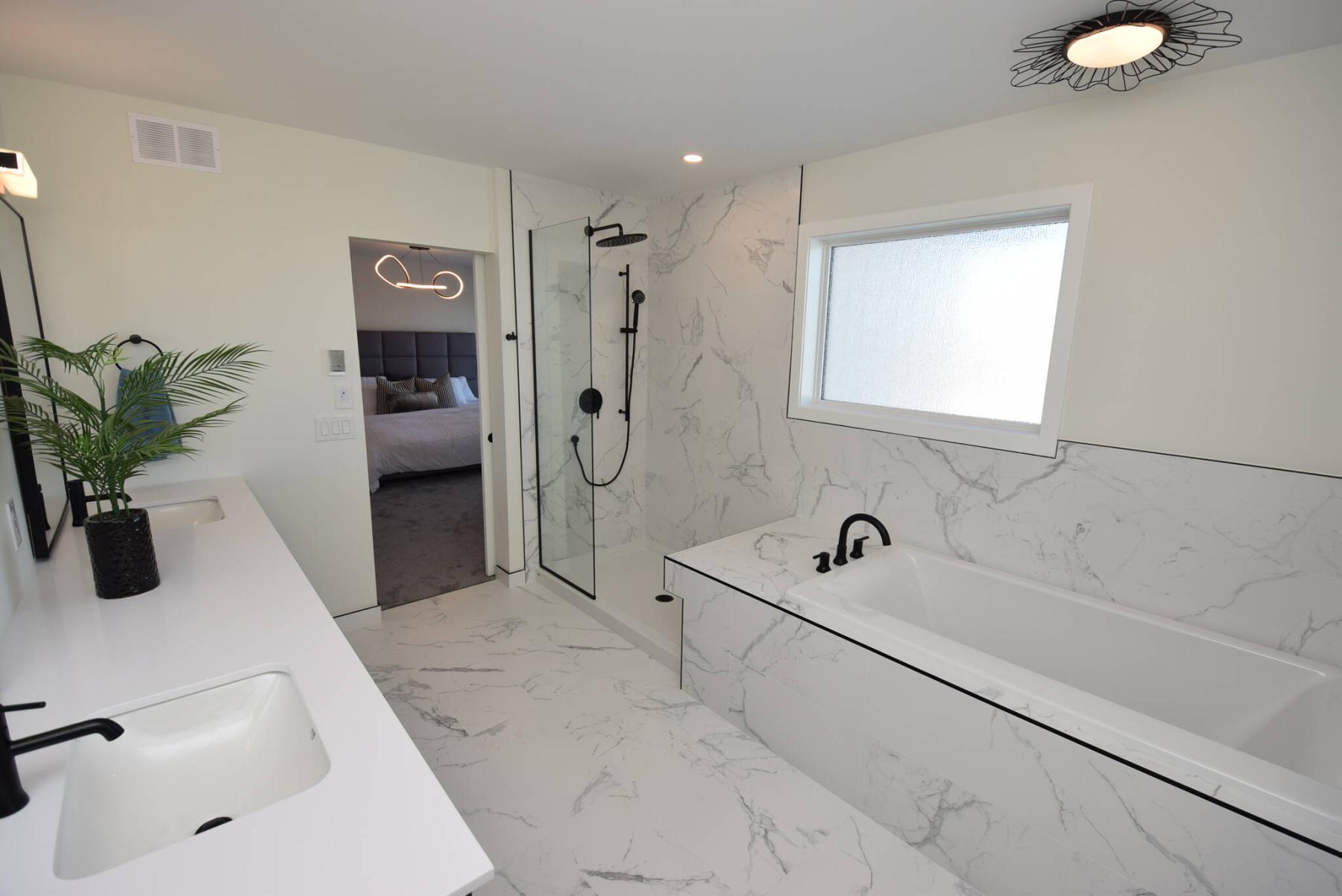 “I would say its defining feature is its gorgeous marble-style porcelain floor and walls,” she says. “The walk-in shower looks incredible with its tile backdrop and black fixtures, while a huge soaker tub was dropped into a tiled surround next to it. A long vanity with quartz countertop and his/her sinks finishes it off perfectly.”